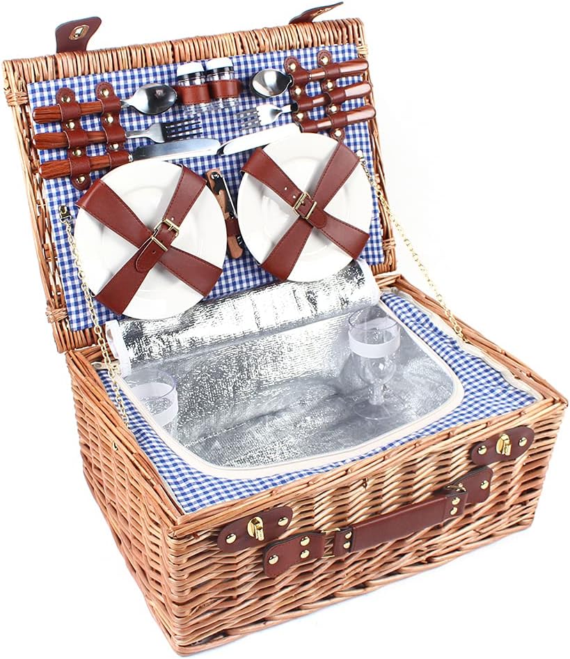 4 Person Insulated Picnic Basket Set Wicker Basket Camping Outdoor 19pcsParameters:Product size: 46.00 x 33.00 x 20.00/18.11*12.99*7.87(inch)Net weight:3KGPacking size: 46.00 x 33.00 x 20.00/18.11*12.99*7.87(inch)Gross weight: 3.500KGType: Basket & Picnic Ware SetColor: Multi-ColorMaterial: Wicker + ceramicPackage list:1 x Picnic Basket2 x Wine glasses4 x Ceramic plate2 x Salt pepper pot2 x forks4 x knifes4 x spoonsNote:1.Due to different producing batches, product details might be a little different. If you mind the difference, please buy it carefully.2.Please allow 1-3CM differs due to manual measurement.3.Due to the different display and different light, the picture may not reflect the the actual color of the item. Thanks for your understanding.