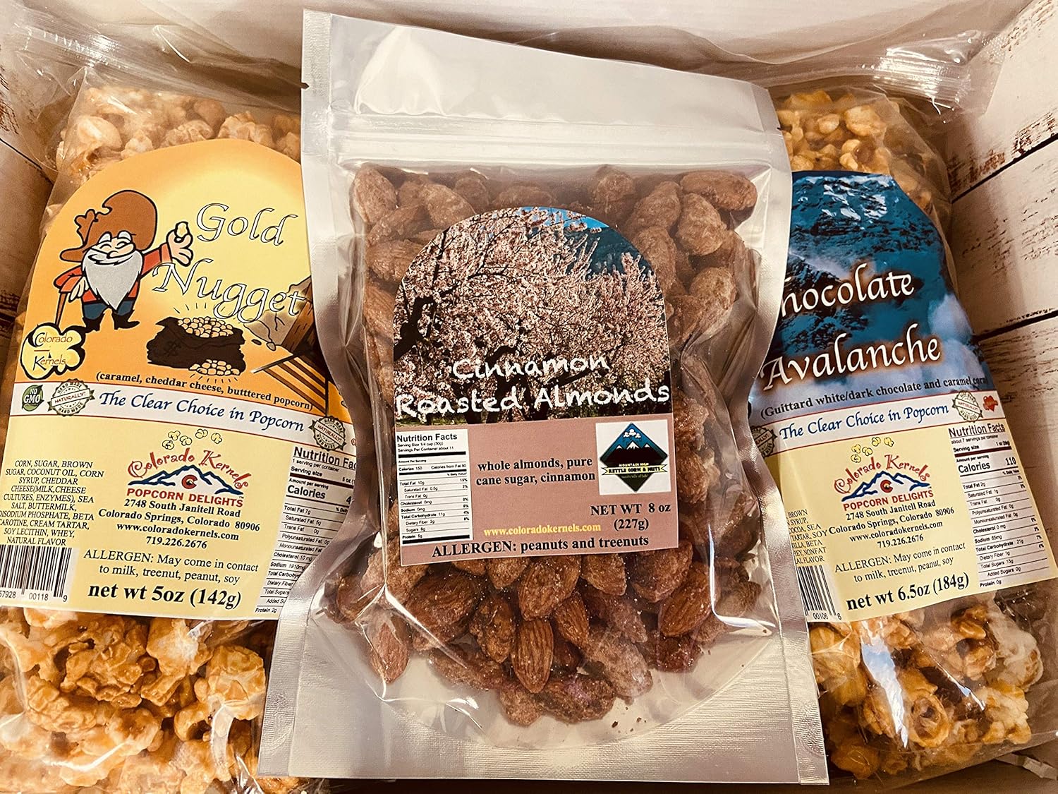 Our variety pack offers our most beloved gourmet flavors. Chocolate Avalanche is caramel corn drizzled with white and dark chocolate. Aspen gold Toffee features popcorn coated in scrumptious handmade toffee. Gold Nugget is a classic mix of our Caramel Sea Salt with Cheddar Cheese Popcorn made with real cheese. Cinnamon Roasted Almonds are made in the traditional German fashion with no oils added. All of our products are made with the finest ingredients right here in the Rocky Mountains of Colorado.
