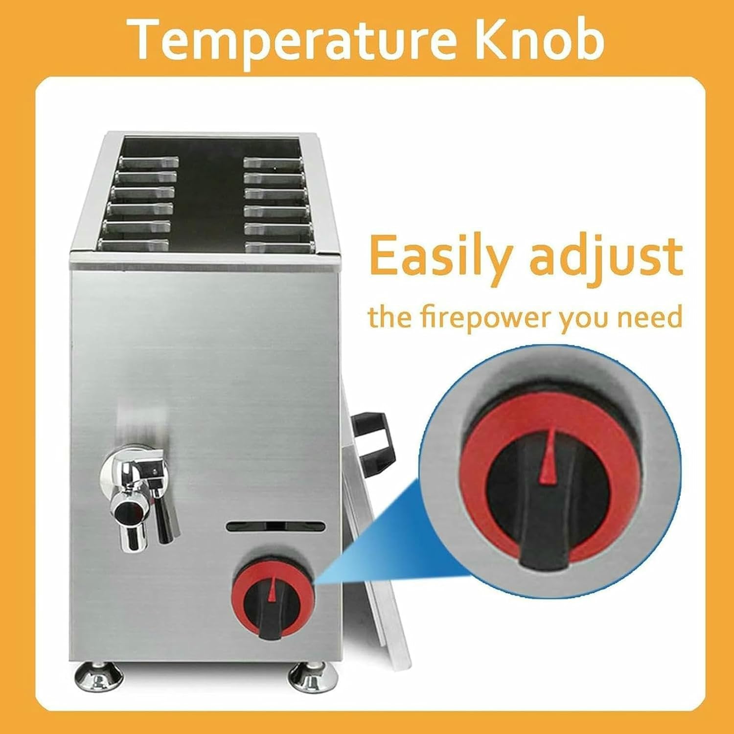 The body is made of thickened stainless steel, which effectively prevents deformation and prolongs service life. The machine is equipped with a faucet-type oil drain port and high-quality foot pads to ensure safe and stableParametersHeating method: gas + pressure reducing valveMaterial: stainless steel Machine size: 580*250*460mm (22.8*9.8*18.1 inch) Fryer capacity: 21L/22qt Weight: 15kg (33lb)Packaging: 1*gas fryer