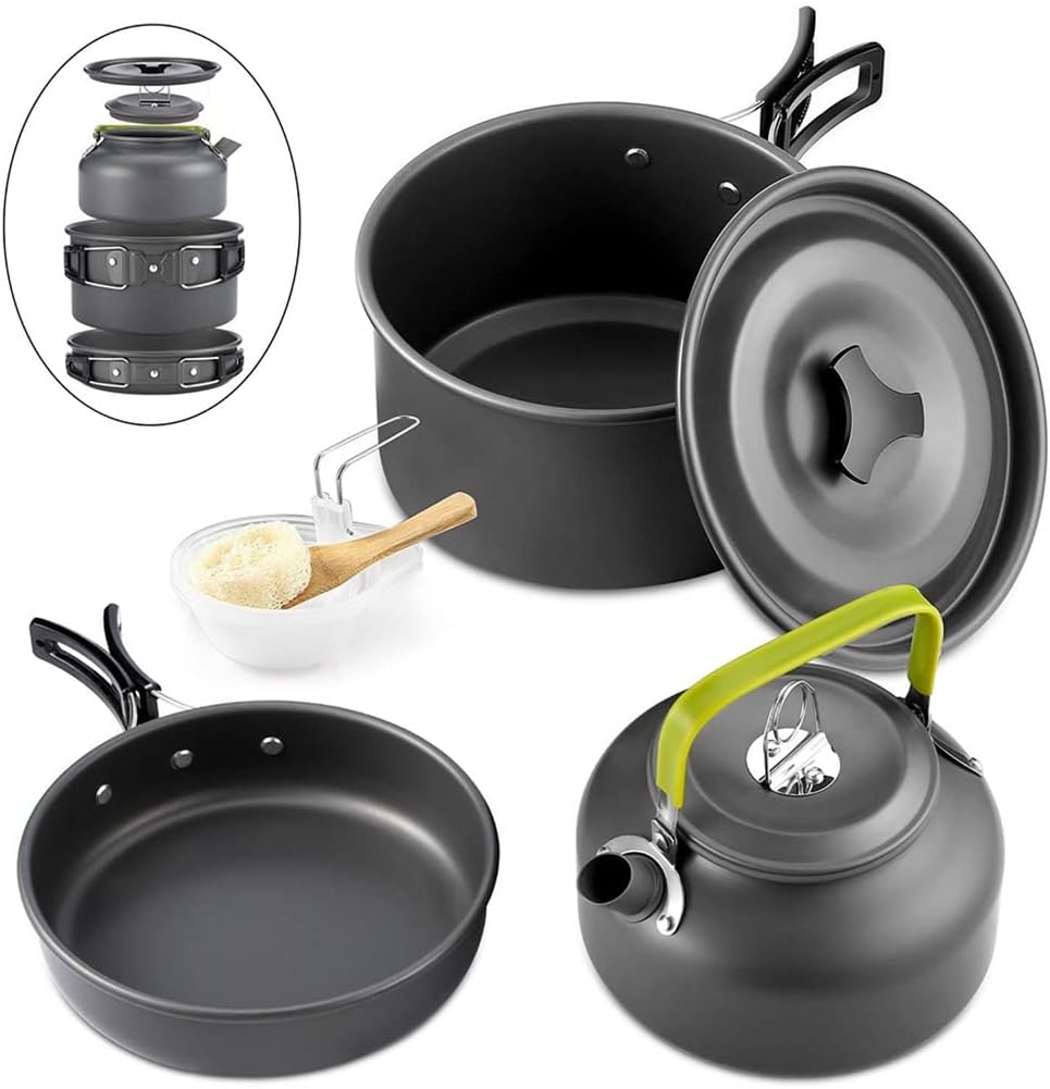 :【Small and Portable】The set adopts a nested structure, which saves space and is convenient for transportation.【EASY TO CLEAN】Stoves, pans and kettles are made of anodized aluminum, which heats up quickly; lightweight, durable and non-stick non-stick coating for easy cleaning and storage.【Foldable Handle Heat Resistant】Silicone insulated handle can prevent burning, can protect your hands from high temperature, non-slip design makes you hold firmly and comfortably【Outdoor Cooking Set】Non-stick pan for frying food; large capacity lid for food or soup.【SUITABLE FOR OUTDOOR COOKING】: The camping cooker is equipped with all the necessities of the kitchen, providing an ideal solution for boiling water and outdoor food.Material; Aluminum AlloySize: As shownColor: as picturedPackage includes: 1 set of pots and pans (other products not included)hint:Please allow slight deviation due to manual measurement.Due to differences between monitors, pictures may not reflect the actual colors of the item. Please refer to the actual product.Please allow for slight size differences due to manual measurement differences.