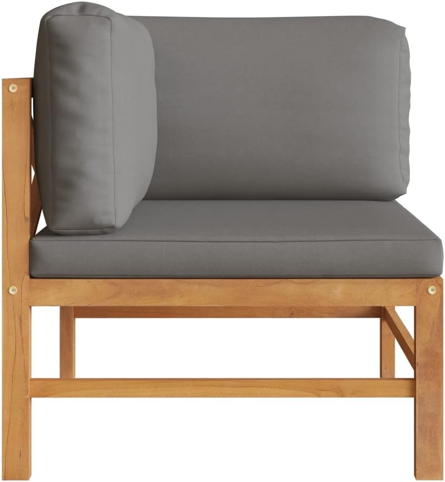 This wooden corner sofa, standing out with the sleek design and soft cushions, makes a great addition to your garden, terrace or patio for chatting with family and friends or just enjoying the weather.Constructed from extremely durable teak hard wood, this piece of teak furniture has been seasoned, kiln dried and then fine sanded to give a very smooth appearance. Teak wood is known for its exceptional strength and weather resistance, making it far more suitable for garden furniture than any other kind of wood. Teak wood is the perfect choice if you want to purchase a long lasting piece of garden furniture. The thickly padded seat and back cushions add to utmost comfort. The sanded surface is easy to clean with a damp cloth. The garden sofa is flexible and easy to move around, which makes it easy for you to create different layouts and fit your needs.Cushion Color: Dark grayMaterial: Fine sanded teak hard wood with waterbase finish, fabric (100% polyester)Dimensions: 26" x 26" x 23.6" (W x D x H)Seat height from the ground: 12.2"Seat size: 24.6" x 24.6" (W x D)Seat cushion thickness: 2"Back cushion thickness: 5.9"Assembly required: YesDelivery contains:1 x Corner sofa1 x Seat cushion2 x Back cushion