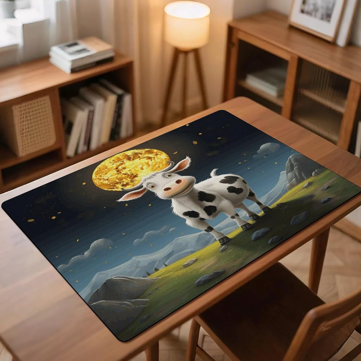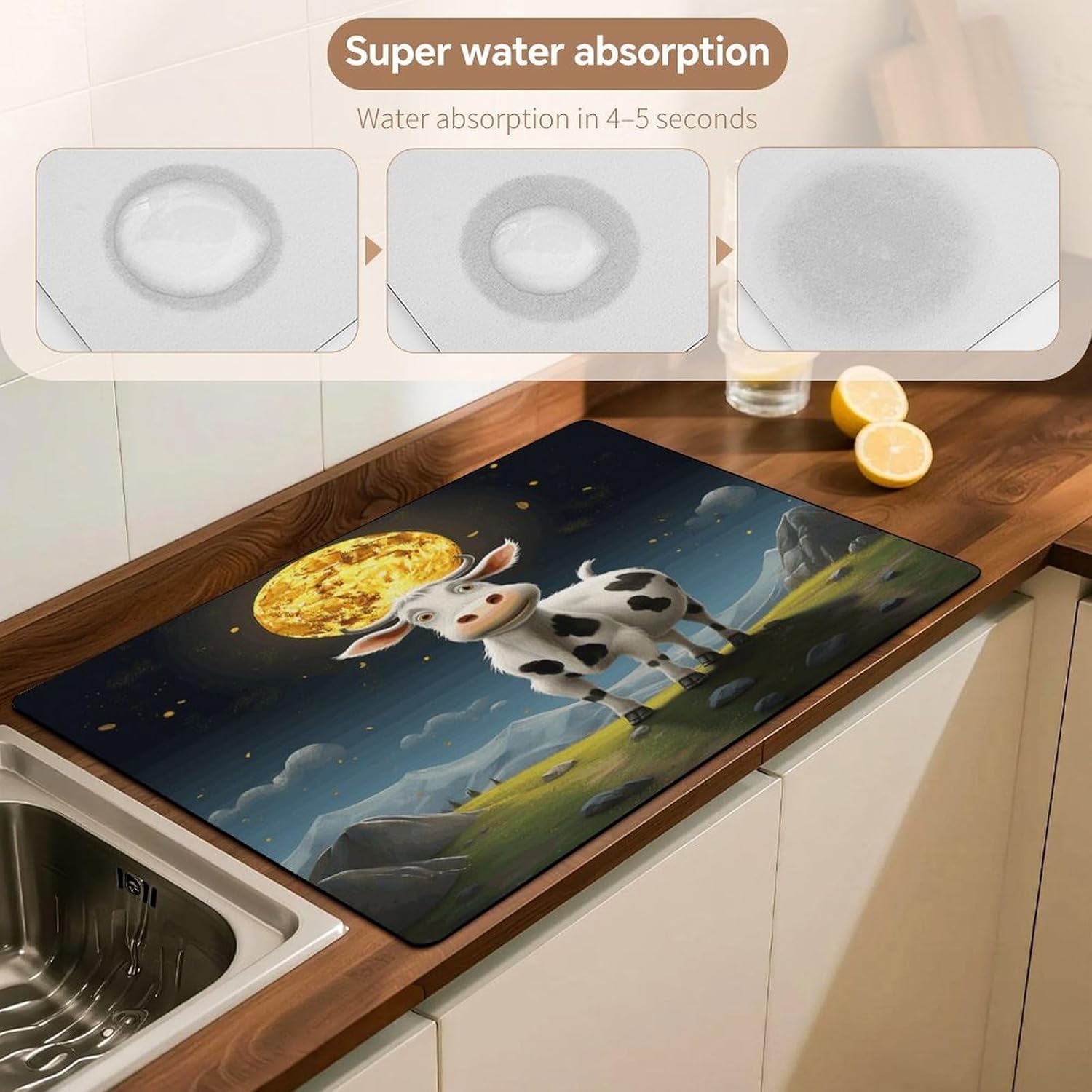 Fast Drying with Diatomite: This Cow over The Moon printing diatomite dish drying mat is highly absorbent, pulling moisture from dishes fast. It helps keep your kitchen counter dry, working better than standard drainer pad options for quicker drying.Stable Non-Slip Backing: The non-slip bottom keeps this Cow over The Moon printing dish drying mat secure on surfaces. Your drainer pad won't slide, safely holding cups and utensils in place on countertops or desks.Five Protective Sizes: Available in five sizes (12"x16" to 30"x40") to fit your space. This drying mat protects furniture from scratches, heat, and water rings, functioning as both a protector and kitchen decor mats.Durable & Easy to Clean: Made from sturdy diatomite and tech fabric, this absorbent and non-slip drying mat for kitchen counter lasts. It's hand washable, supporting a clean kitchen, office, or cafe.Multi-Use for Home & Office: Beyond the kitchen, use this diatomite dish drying mat as a desk pad, coffee station mat, or dish drainer pad in a bar. It's a versatile solution for adults, homeowners, and professionals.Modern Design & Safe Edges: Featuring modern prints and rounded corners, this Cow over The Moon printing drying mat serves as stylish kitchen decor mats. The design is safe and prevents edges from curling over time.Our Assurance: We stand behind our drying mat's quality. Designed as a reliable, absorbent, and non-slip aid, we ensure it meets your needs. Our support team is ready to assist.