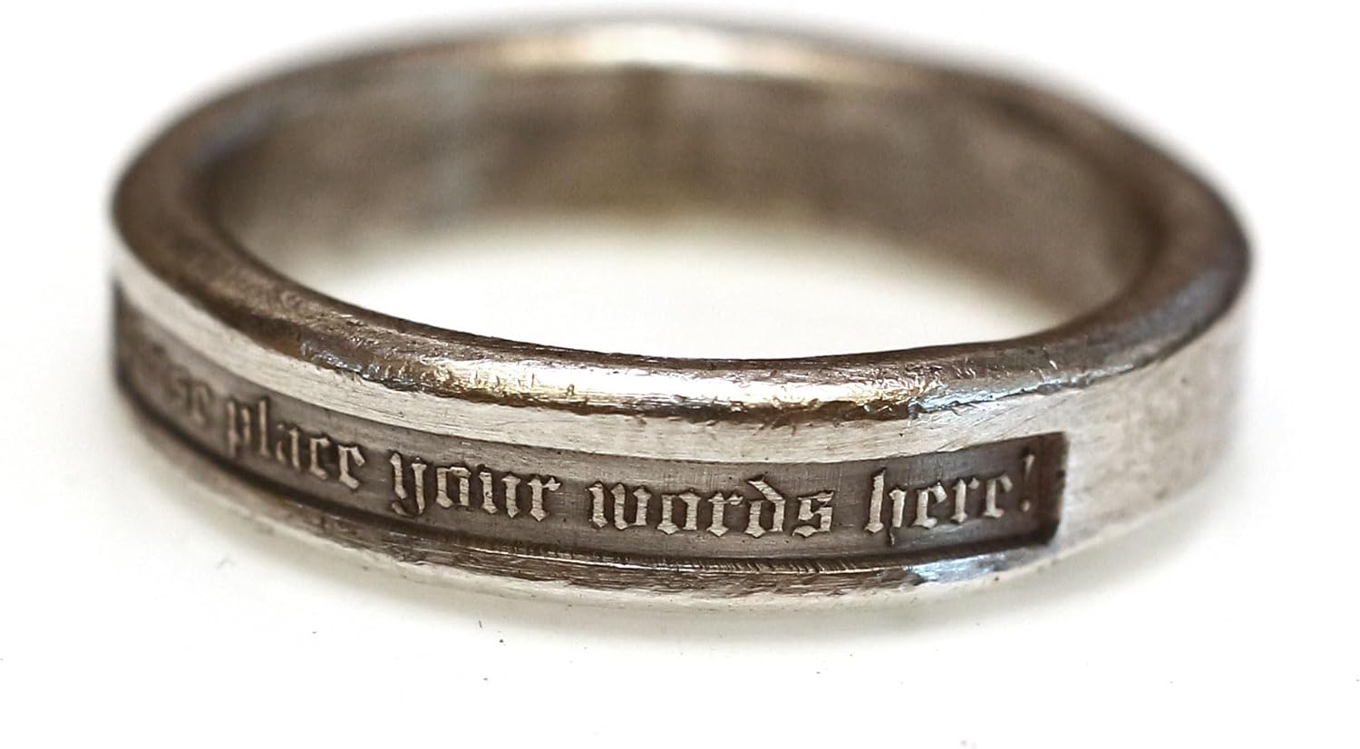 Rustic silver ring with custom word in raised tiny old English. The words can be fully customized. Up to 25 characters of small case alphabets, numbers, punctuation are available. -CAUTION- Every ring I make are true to size. I always consider width of the rings when I work on sizes. Please do not order larger or smaller than your finger size. Measuring your finger with string, tape measure or paper strip is not accurate at all. And measuring your own ring by diameter is even worse. Please measure your finger from a jewelry store for a perfect fit. -Please provide your phone number for the packing slip when you check out- *The hallmark stamps could be changed without notification. . Made of oxidized silver by more than 20 years experienced jewelry smith . Item code: RS-181 Raised Roman Word Ring . Thickness: 2mm, width: 4mm, weight: 6g . a~z, 1~0, punctuation are available up to 25 character(spaces don't count) . Vintage finishing has applied for aged look * Please leave a note of the words you wish to be done on the ring when you check out. Once the work is done the words can't be changed.