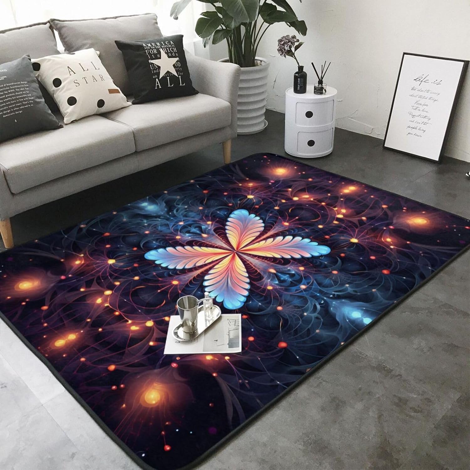 This Cyclic flowers printed decorative carpet is made of polyester flannel, which is delicate and soft to the touch, with tight and regular pile. It will not pill or fade after long-term use, and will always look like new. The middle layer uses high-density memory foam, which can automatically adjust according to the foot shape and pressure, providing precise massage for tired feet and relieving fatigue. The bottom is designed with non-slip plastic bottom non-woven fabric, which can firmly grip the ground even when it encounters water or on smooth surfaces, ensuring the safety of the elderly and children. It is easy to clean daily, can be machine washed or hand washed, and is wear-resistant and does not shed. Exquisite stitching technology and high-quality tailoring, with smooth edges, are suitable for a variety of scenes such as bathrooms, living rooms, and bedrooms. Non-slip, comfortable, and durable, adding a touch of intimacy and elegance to your life.