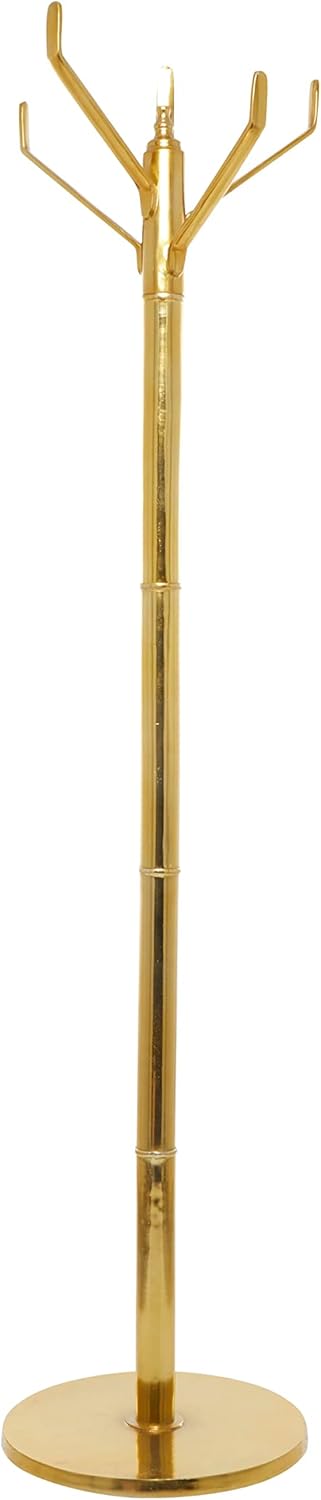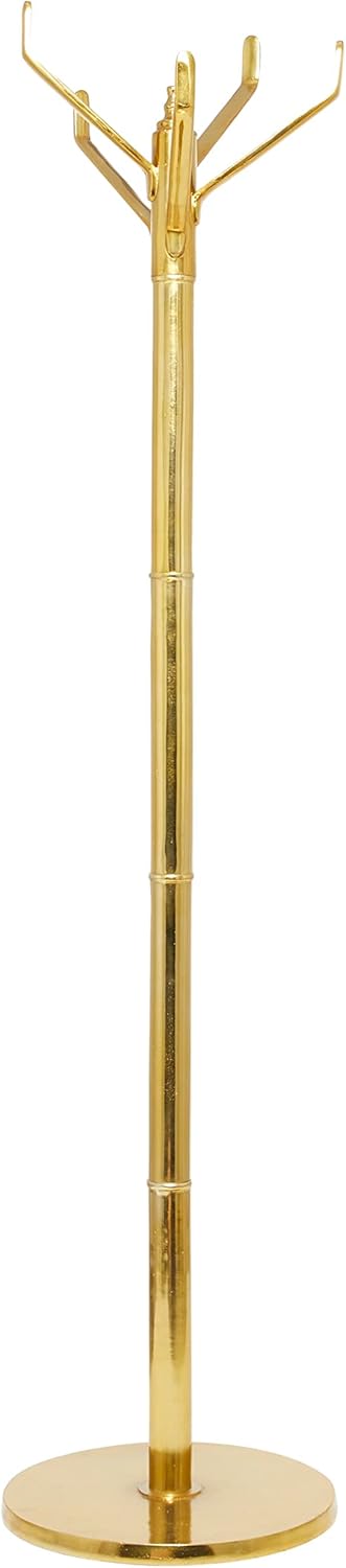 Great for hanging coats, purses, scarves, and more, this coat rack is as functional as it is stylish. Create a storage for your belongings while keeping them protected and off the surface floor. Display this modern gold coat rack as functional and decorative accent piece on your entryways and hallways. This item ships in 1 carton. Suitable for indoor use only. This item ships fully assembled in one piece. Maximum weight limit is 25 lbs. Made in India. This is a single gold colored freestanding coat and hat rack. Contemporary style.
