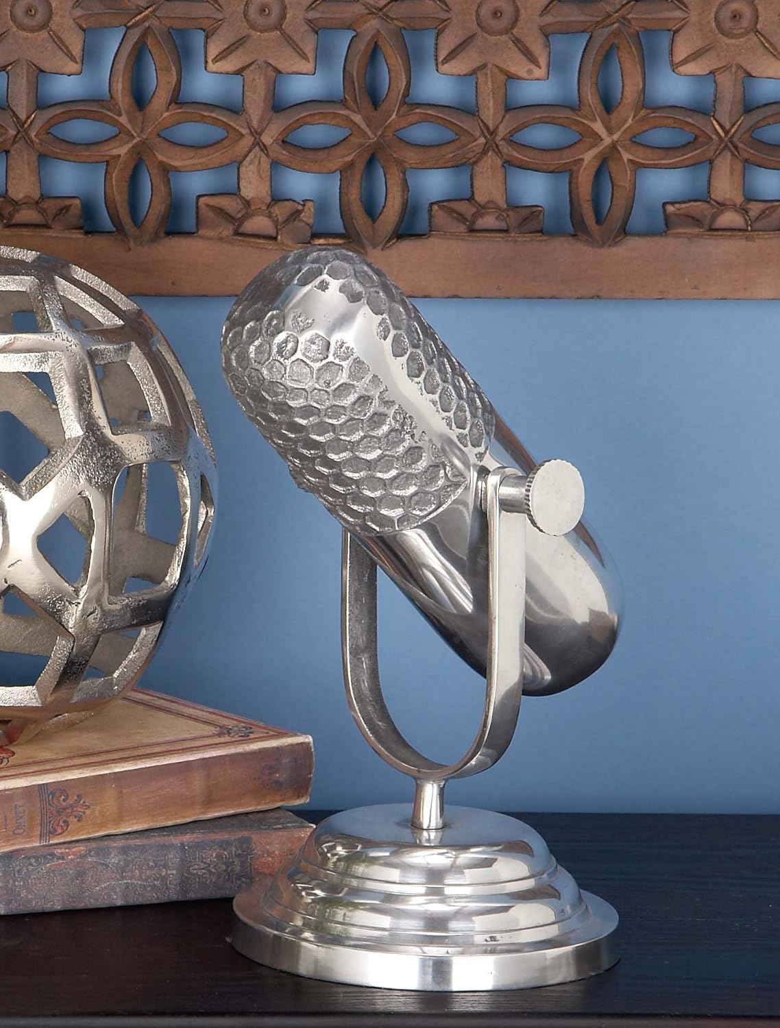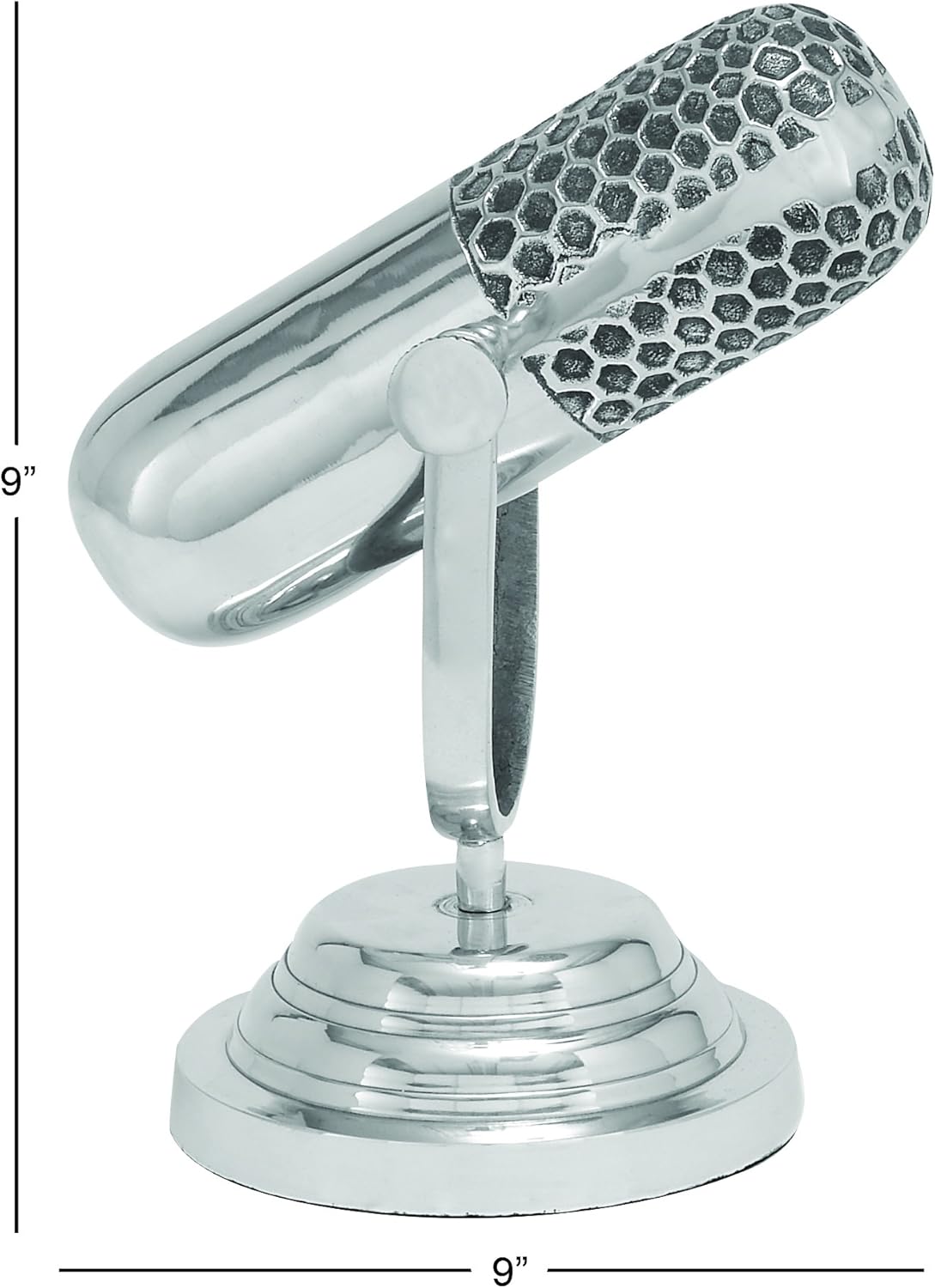 As this microphone is non-functional, use it as an accent centerpiece in your space near another metal decor, exposed brick, or metal piping to bring bold a retro charm to the table. Designed with felt or rubber stoppers at the base that prevent scratching furniture and table tops, as well as sliding around. This item ships in 1 carton. Please note that this item is for decorative use only. Aluminum sculpture makes a great gift for any occasion. Suitable for indoor use only. This item ships fully assembled in one piece. Made in India. This is a single silver colored statue. Traditional style.