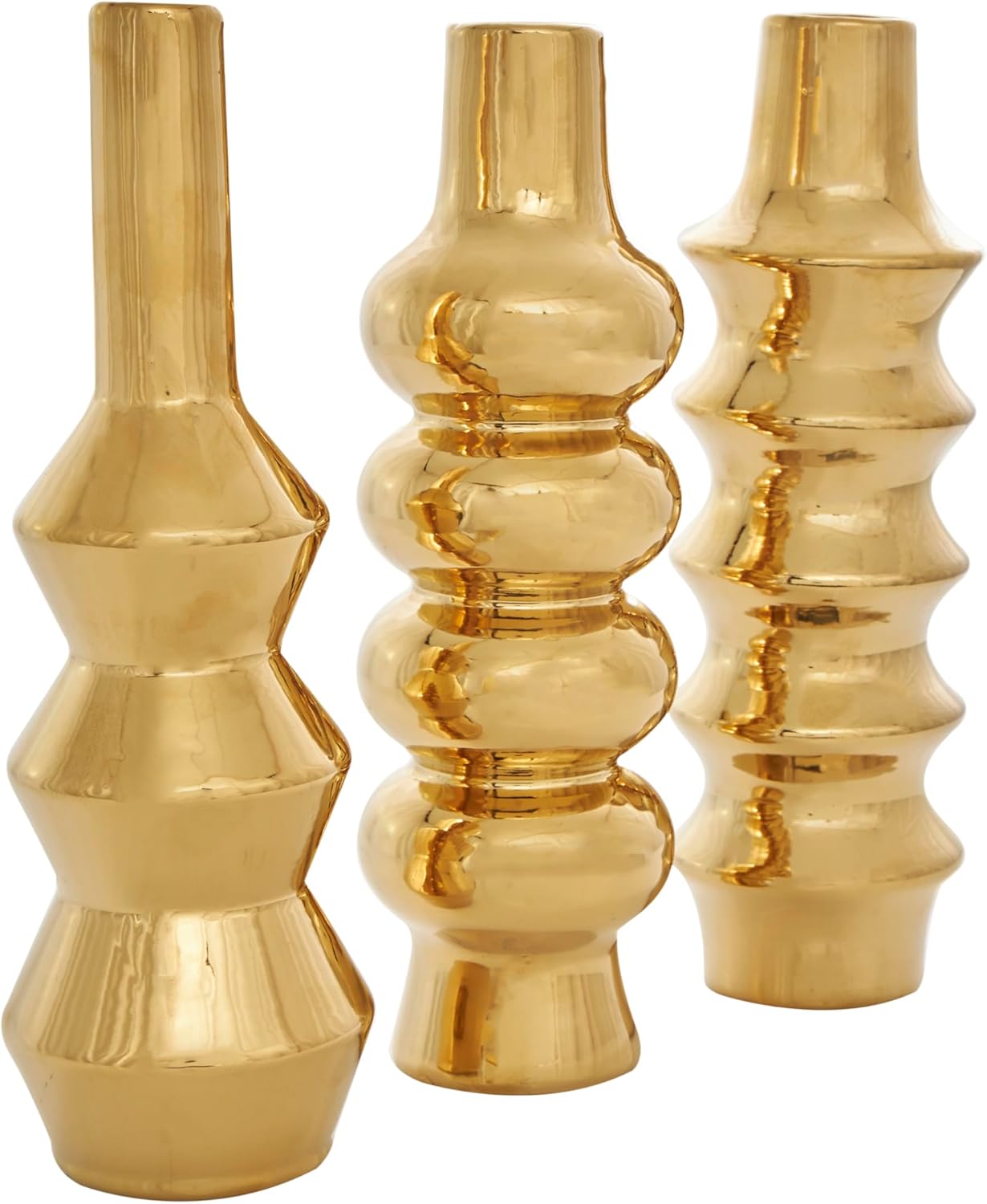 Each piece in the contemporary set of 3 vases for home decor is crafted from durable molded ceramic with a bubble-inspired design. The glossy gold vases for dried flowers boast varying round and bubble shapes that create visual interest. Wipe clean with a dry cloth. Perfect for living rooms or dining tables, the abstract set of 3 centerpiece vases adds a modern touch. Designed with felt or rubber stoppers at the base that prevent scratching furniture and table tops, as well as sliding around. This item ships in 1 carton. Ceramic vase makes a great gift for any occasion. Suitable for indoor use only. This item ships fully assembled in one piece. This gold colored ceramic vase comes as a set of 3. Contemporary style. Vases have 1.10 in, 1 in, and 1 in mouth openings.