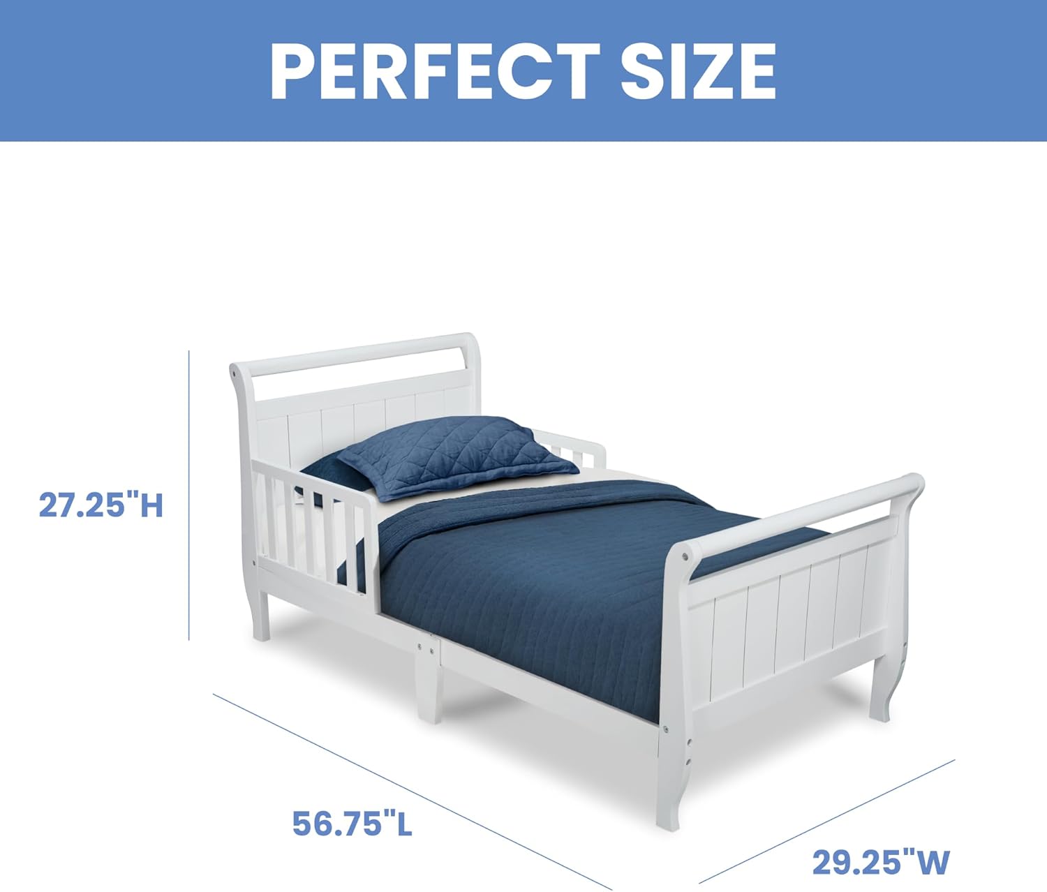 Tuck your little one in for a night of sweet dreams with this Wood Sleigh Toddler Bed by Delta Children. Made from sturdy hardwood, it has an elegant sleigh-style design, bringing a timeless look to any bedroom. Attached guardrails give you added security and keep your little one safe throughout the night. It's the perfect bed for toddlers who have outgrown their cribs and are making the transition to big-kid bed. Bed fits a standard size crib mattress (mattress sold separately). Recommended for ages 15 months+. Delta Children was founded around the idea of making safe, high-quality children's products affordable for all families. They know there's nothing more important than safety when it comes to your child's space. That's why all Delta Children products are built with long-lasting materials to ensure they stand up to years of jumping and playing. Plus, they are rigorously tested to meet or exceed all industry safety standards.
