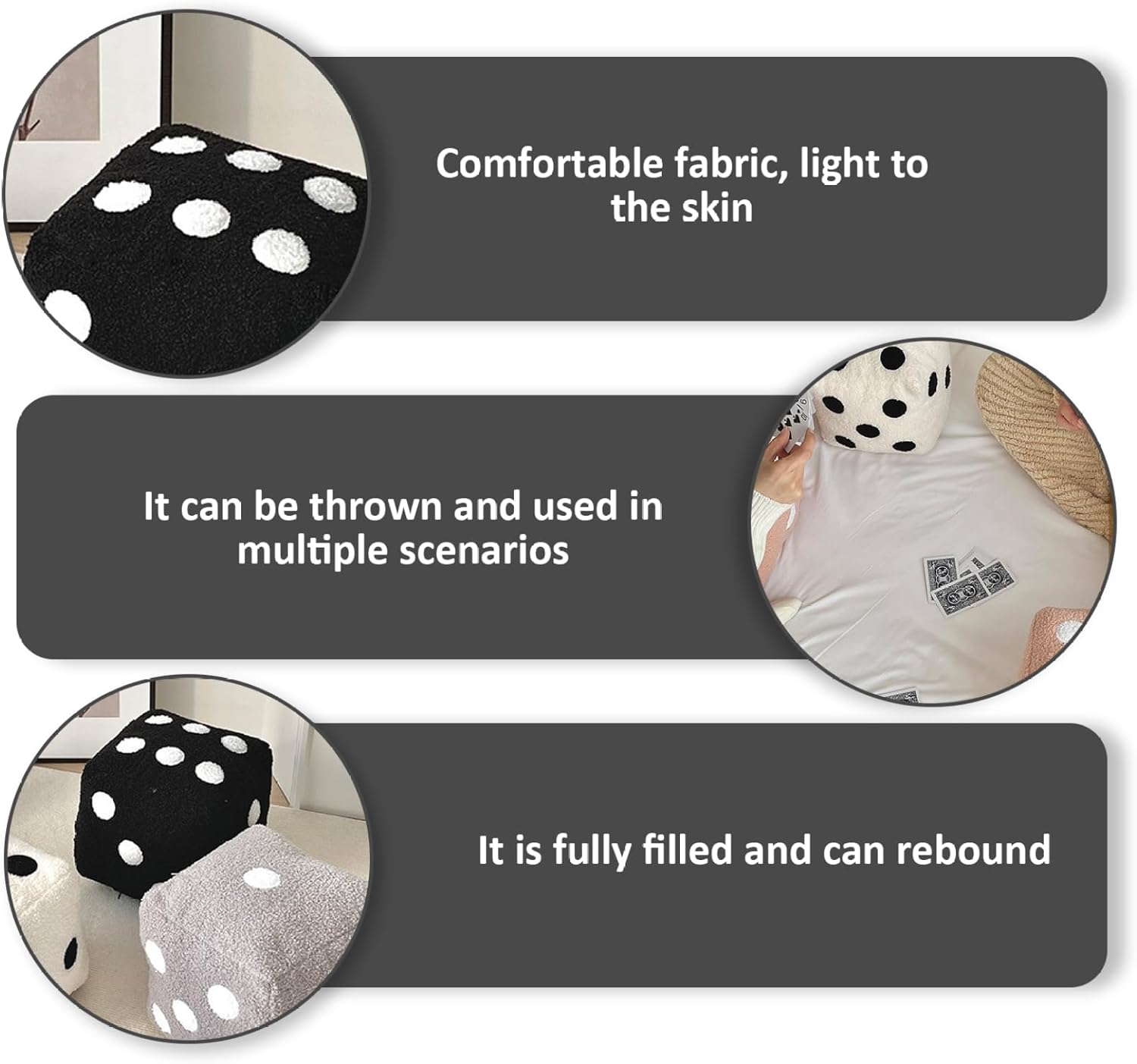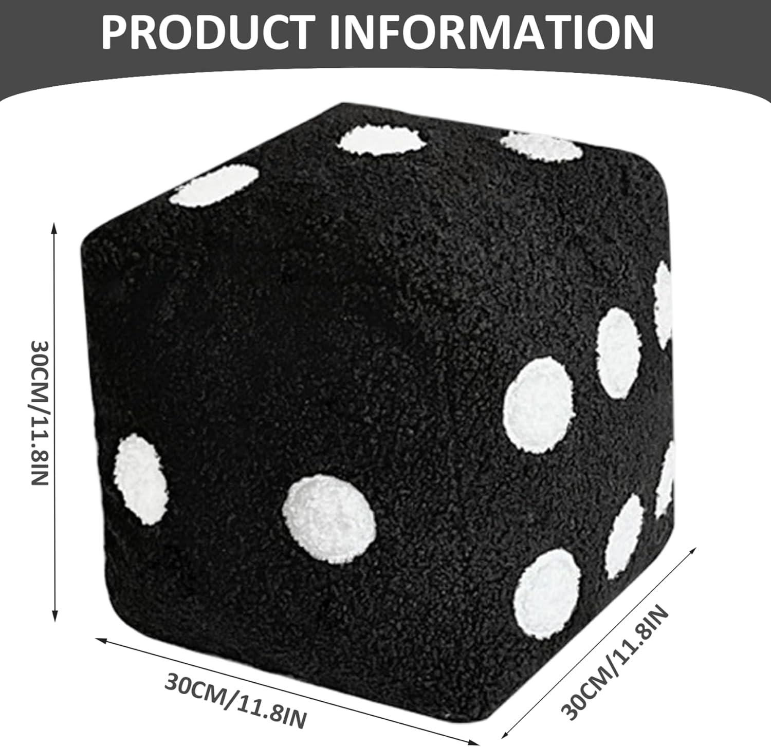 Description: This 12-inch dice pillow features a unique 6-sided plush design made from ultra-soft fuzzy material that exceptional comfort and tactile delight, making it an ideal addition to your home, office, or party settings. Its versatile use as a plush pillow, sofa cushion, or kids' toy ensures both functionality and decorative appeal, enhancing any space with a playful and stylish look. The construction maintains shape and softness through regular use while providing safe, kid-friendly materials that are reliable. Whether placed on your couch, bed, or in a hotel room, this plush dice pillow combines decorative charm with cozy comfort, transforming ordinary spaces into inviting, enjoyable environments. Its medium size makes it easy to integrate into existing decor without overwhelming your setup, while the bold black color adds a sleek, modern feel that complements diverse interior styles. Perfect for gifting or personal use, it invites relaxation and fun for all ages. Features:. Dice Pillow. -Color: Black. -Material: Plush, PP Cotton. -Size: about 30*30cm/11.8*11.8inch. Note:Manual measurement, please allow slight errors on size.The colors may exist slight difference due to different screens. Package Including 1Pcs Dice Pillow