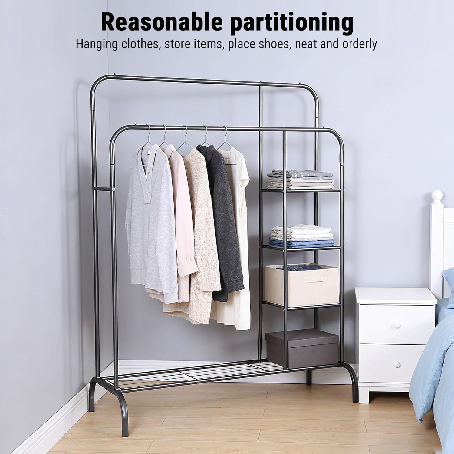 1. Stainless Steel Construction: Built to withstand 50% more weight than most standard garment racks. Crafted from stainless steel with an advanced five layer protective coating and special sealant, this rolling rack reliably resists scratches and wear for exceptional longevity. 2. Space Saving: This portable clothing rack fits wherever you need it, bedrooms, walk in closets, laundry rooms, or entryways, helping you organize garments efficiently and maintain a tidy space. 3. Enhanced Stability, Easy Assembly: Features an upgraded design with threaded connectors for seamless assembly that saves time. Compared to screw fixed racks, this stainless steel rack installs more quickly while delivering more secure connections with minimal wobble. 4. Locking Wheels: Equipped with 360 degree swivel casters that roll smoothly. The locking casters allow you to securely stop the garment rack when needed, with no noisy squeaking or floor scratching during movement. 5. Multi Functional Storage Solution: Designed with a high low bar configuration offering ample hanging space for clothes, shirts, pants, and even long dresses. The bottom shelf is ideal for shoes or storage bins, while four side hooks are suitable for holding hats, scarves, and bags. Spec: Item Type: Clothes Rack Material: Stainless Steel Weight: Approx. 3800g / 134oz Product Size: Approx. 130x49x154cm / 51.2x19.3x60.6in PackageList: 2 x Long U Shaped Tubes 2 x Short U Shaped Tubes 6 x Long Tubes 1 x Short Tube 3 x Short Mesh 1 x Long Mesh 8 x Accessories 38 x Screws 1 x Wrench 8 x Nuts 1 x Installation Diagram