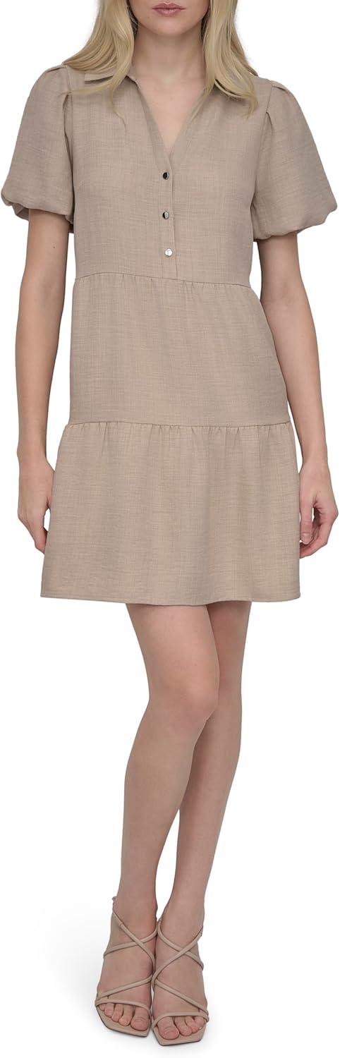 This DKNY Women's Dresses Dress is a Short Bubble Sleeve Collared Neck Tiered Skirt Dress