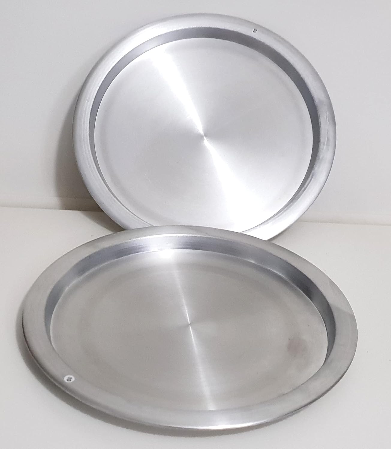 DLK - 2 x 13 inch Aluminum Kunefe Tray, Kunafa Plate Set, Kunefe Pan Set of 2 for Sweet ,Kunafeh or Kadaifi The set consists of 2 pieces. It is made of Aliminium. Does not contain harmful substances and chemical paint. Made in Turkey. Designed for baking kunefe on an electric or gas stove. It can withstand high extremely temperatures. Color of the product is silver. It can be used for long years. You can prepare kunefe sweet with the product. It is suitable for cooking and serving trays. It is used in homes, cafe, restaurants or hotels. The product can use special presentation and services. It is not washed in the dishwasher. It should be wash by hand. It is easy to clean. The product is ideal gift for mother day,father day, easter or housewarming too. Before using the product wash by hand for fisrt time with plenty of soapy water and dry it. Don't use wire brushes and bleach. it must dry after each wash. Aluminium may lose its luster due to its natural structure. For this reason, you can wipe the product with a vinegar cloth or rub them with lemon and salt to restore their former shine. In this way, your products will regain their former shine. Aluminum is preferred by professional pastry shops and confectioners as it spreads heat evenly and quickly. Dimensions: Outher Diameter: 13.75 inch (35 cm) Inner Diameter: 11.75 inch (30 cm) Height: 0.8 inch (2 cm) Thickness: 0.005 inch (1.10 mm) Weight: 1 lb (450gr)