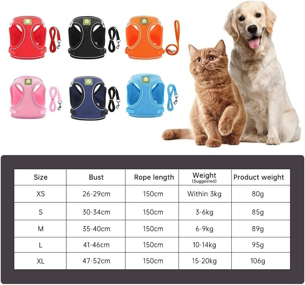 Reflective Safety: reflective material, ensuring the canine's safety above all else whether it is day or night. Straps: Adjustable straps with quick-release buckles are also in-bedded with reflective pipping. (Extra reflective coverage) . Interior : Nylon webbing with soft sponge padded sections with key load dispersion for comfortable extended wear. All-weather feature: Helps keep pet's body temperature cool in summer by releasing excess heat and warm in the winter by retaining heat. Ergonomic design : Easy on, easy off. Reduces risk of common harness chafing irritation of skin by repetitive friction. Specification: Material:Polyester Mesh Size: XS, S, M, L, XL notes: 1. There may be some slight differences between the color of the image and the actual item. 2. Due to manual measurement, please allow a measurement deviation of 1-2mm. The main product is the main product, others are not for sale.