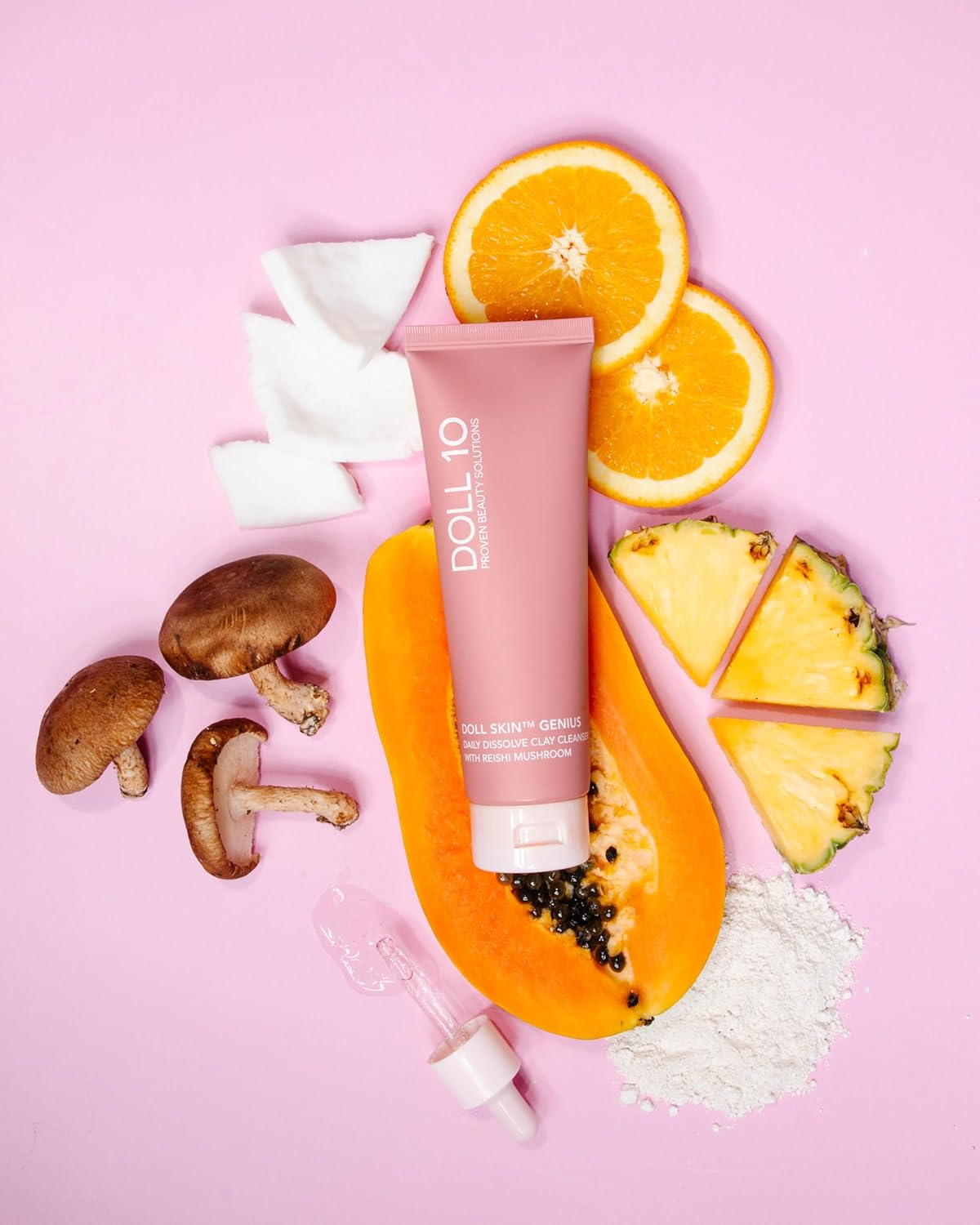 DOLLSKIN GENIUS DAILY DISSOLVE ENZYME CLAY CLEANSER WITH REISHI MUSHROOM is genius, 4-in-1 clay cleanser that cleanses, exfoliates and tones in just one step. The foamy texture harnesses the power of clay + enzymes to gently exfoliate skin while dissolving makeup, dirt, and oil, creating a baby-soft canvas. Formulated with antioxidant-rich Vitamin C & Noni Juice to brighten, Niacinamide to hydrate, dissolving natural clay exfoliants as well as Pineapple Enzymes to leave skin looking clean, bouncy, and glowing.