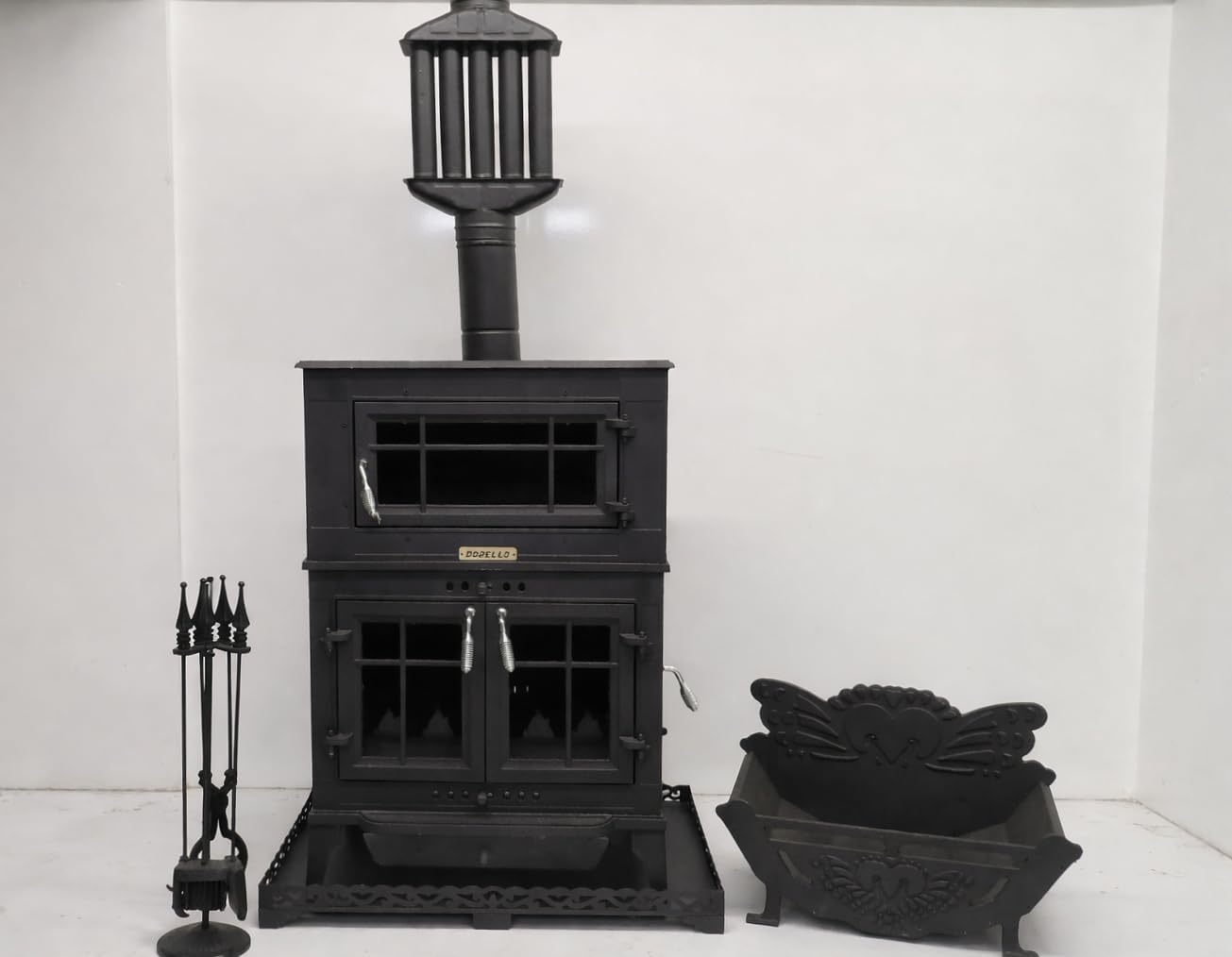 The Dorello 16 Portable Wood Burning Stove is a rugged, heavy-duty cast iron stove built for campers, cabin owners, and outdoor enthusiasts who demand reliable heat wherever they go. Featuring a classic two-tier design, this stove includes a spacious upper oven compartment with a glass-windowed door, perfect for baking or warming food, and a large lower firebox with double glass-panel doors that let you watch the flames while keeping heat contained. The sturdy cast iron construction ensures exceptional heat retention and long-lasting durability, even under demanding conditions. Elegant coil spring handles and decorative flame motifs add a timeless, rustic charm that looks right at home in a cozy cabin living room or a campsite setup. The pull-out ash drawer at the base makes cleanup simple and convenient. Whether you're heating a tent, a small cabin, or an outdoor shelter, the Dorello 16 delivers powerful, consistent warmth with a classic aesthetic. A flue pipe connection at the top allows for proper ventilation when used indoors. This versatile wood-burning stove is the perfect companion for cold-weather adventures.