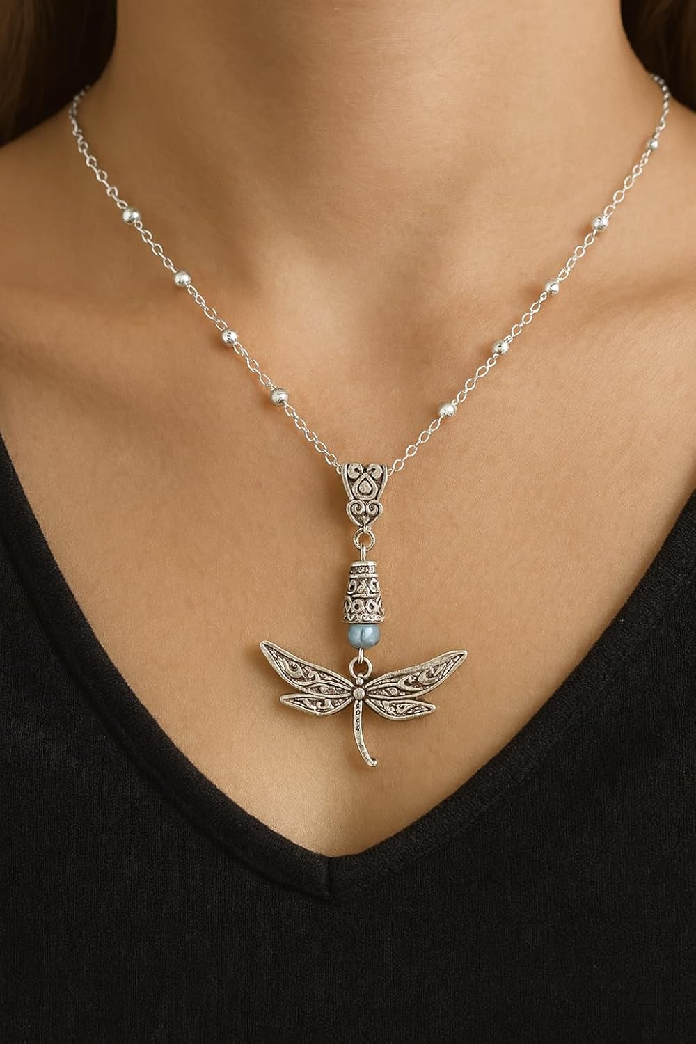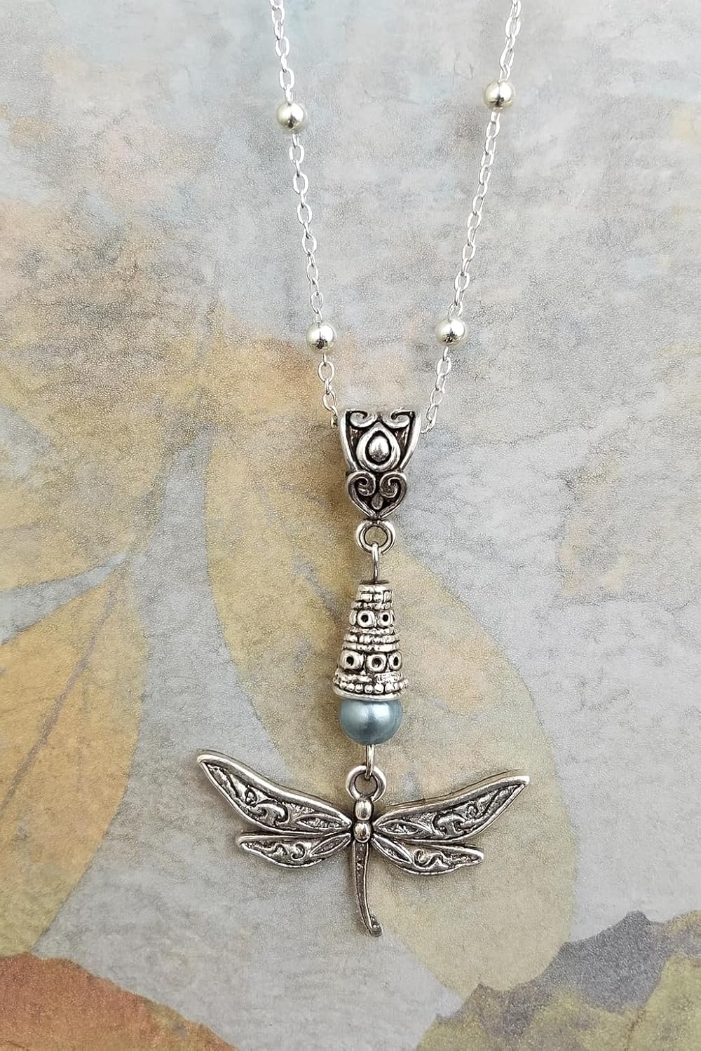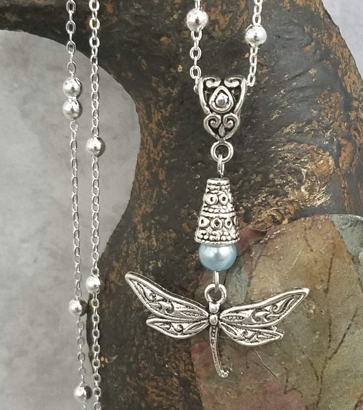 Artist Hand Created! A detailed dragonfly accented with a light blue glass round bead and etched cone, hung on an 18 inch sterling silver chain. The charm, cone, and bail are a silver alloy that is free of nickel, lead, and cadmium. The pendant, including the bail, glass round, and dragonfly measures 1 3/4 inches long by 3/4 inches wide. If you would like your necklace to be longer, semiprecious accent hand created extender chains are available. Dragonfly earrings and a dragonfly pearl bracelet are also available in the 12:13 Jewelry Amazon Handmade store.