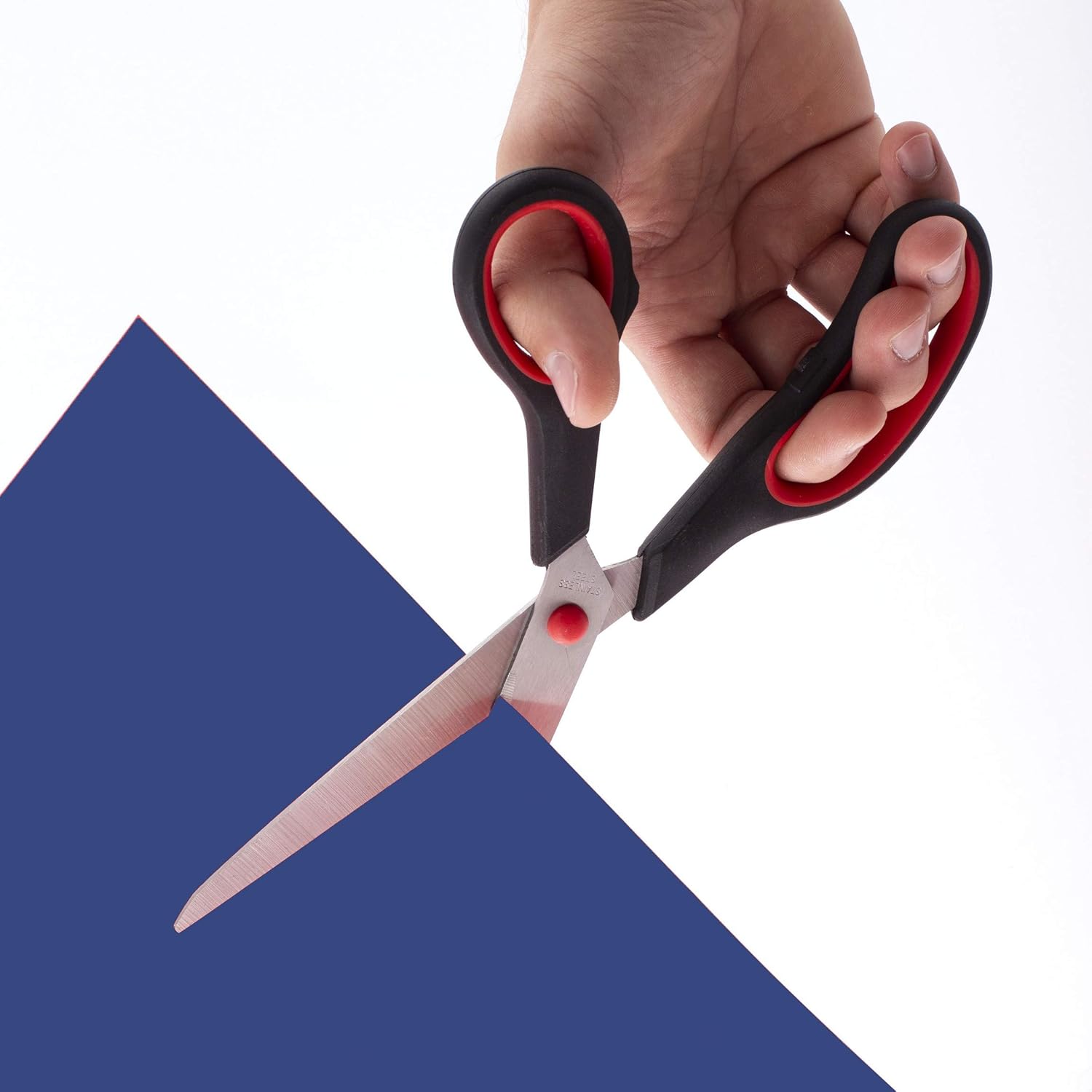 Universal office scissors, intended for cutting paper, cardboard and plastic filmBlades made of stainless steel guarantee a sharp and precise cut.Ergonomic handle covered with rubber, made of unbreakable plastic ensures a comfortable use.Convenient packaging types TRY-MELotal length 250 mm