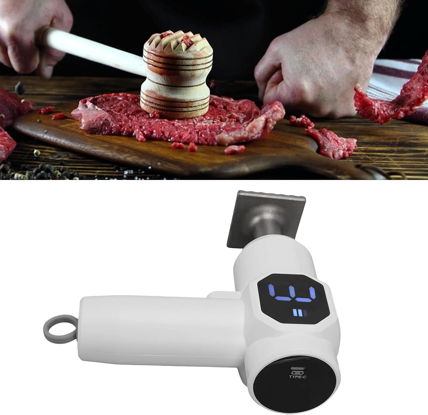 1. Upgrade Your Kitchen: This electric meat tenderizer doubles efficiency compared to manual tools, powered by automated technology to save time and effort. The 30W motor with 6 adjustable speeds handles everything from poultry to thick beef cuts with precision. 2. Versatile Performance: Whether you're a home cook or professional chef, this stainless steel tenderizer ensures effortless meal prep. Its robust design delivers restaurant grade results on steaks, chicken, and pork chops every time. 3. 304 Stainless Steel: The meat tenderizer features 304 stainless steel heads, ensuring long lasting use. This food safe material outperforms plastic or aluminum alternatives for consistent tenderness. 4. Precision Control: Adjust the 6 speed electric meat crusher to break down tough fibers without overworking delicate cuts. The built in 3000mAh lithium ion battery supports extended use for uninterrupted cooking sessions. 5. Ergonomic and Efficient: Designed for ease, this electric tenderizer combines power with comfort. The lightweight yet sturdy construction makes it ideal for frequent use while maintaining professional texture in every dish. Spec: Item Type: Electric Meat Tenderizer Tool Material: ABS Battery Type: Built in Lithium ion Battery Battery Capacity: 3000mAh Weight: Approx. 735.00g / 25.93ozSize: Approx. 16 x 16cm / 6.3 x 6.3in packing list: 1 x Electric Meat Tenderizer 1 x Tenderizing Head 1 x USB Cable Notice: Do not disassemble the host casing, battery, or motor by yourself.