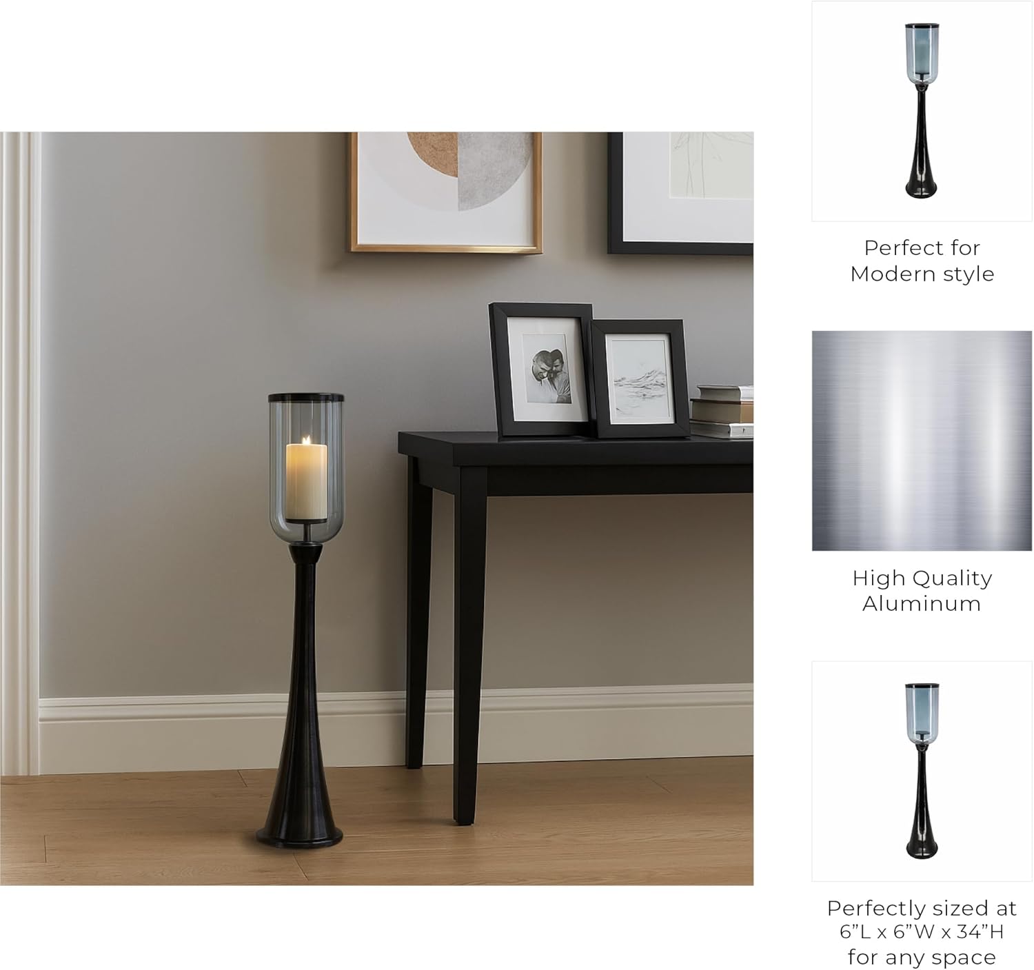 Elevate your home with the dramatic size and elegance of this 6" L x 6" W x 34" H black glass hurricane candle holder, designed in the radiant style for timeless beauty. Crafted from polished metal with a tall glass shade, it functions as both a practical lighting accent and a sculptural piece of art. Styled as a minimalist candle stand, it balances proportion and presence while allowing candlelight to shine with clarity. Its reflective finish and transparent hurricane form transform simple flames into a sculptural candle accent, enriching mantels, consoles, and dining tables with a refined glow. This tall piece integrates seamlessly with other indoor candle holders, adding vertical contrast, or pairs easily with patio candle holders to extend ambiance outdoors for festive evenings. For weddings or formal celebrations, it transitions effortlessly into wedding decor, where its height and shimmering finish create unforgettable displays. At mealtime, it anchors table centerpiece decor, offering vertical drama and sophistication for both casual dinners and special gatherings. During the holidays, it becomes a striking holiday accent, spreading candlelight among garlands, wreaths, or seasonal displays. Beyond festive occasions, it serves year-round as a reliable home decor accessory, built with quality materials for durability and style. Grouped with complementary pieces, it can create a layered tall candle holders display, bringing balanced scale and proportion to large spaces. Its radiant finish and sculptural design also place it among luxury candle holders, admired for artistry and craftsmanship. When greater presence is required, it shines as one of your statement candle holders, providing drama while blending into rustic, modern, or transitional interiors. Every element, from its graceful glass shade to its polished black base, makes this more than functional, it is a decorative accent piece that combines light and artistry to transform your home with timeless elegance.