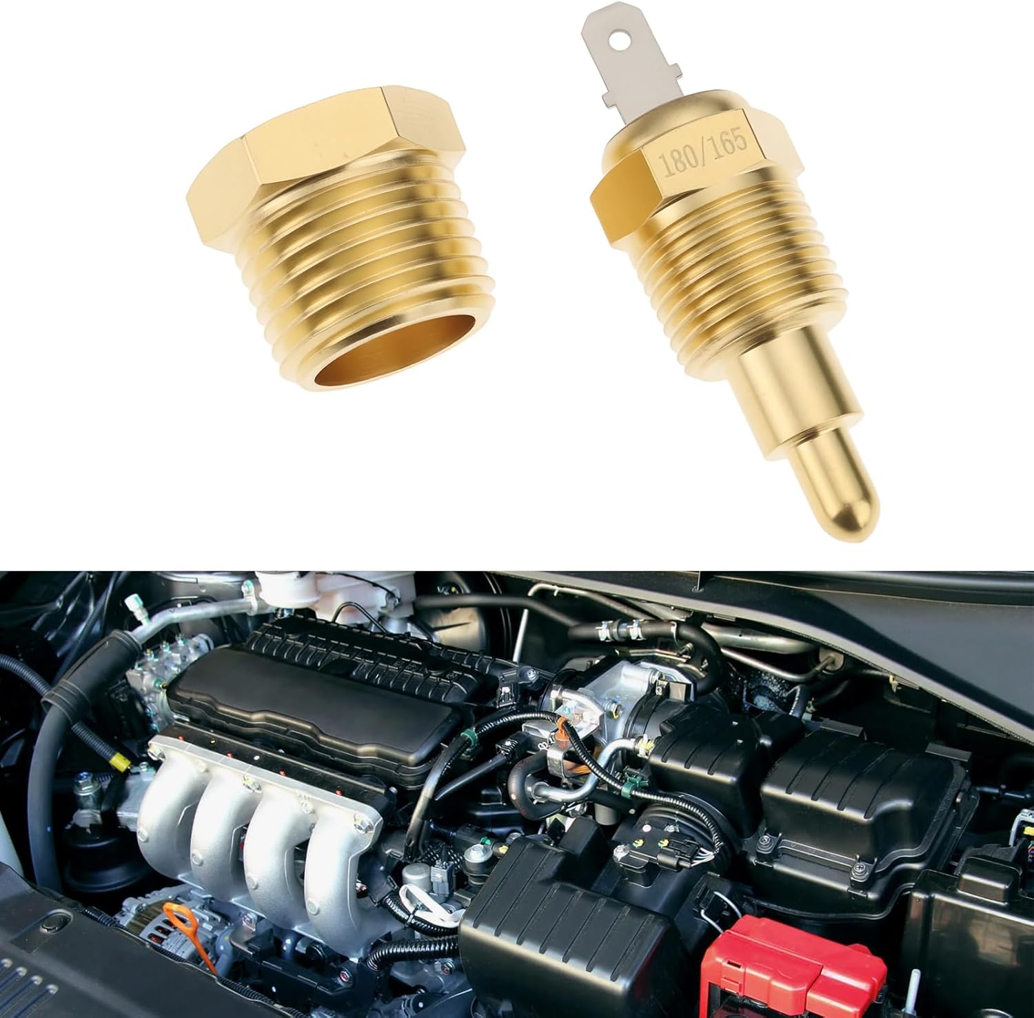 Item Descriptions:-Automatic Fan Control: Activates the cooling fan at 180°F and turns it off at 165°F for stable engine temperatures.-3/8" NPT Thread: Brass thread-in temperature probe fits any cooling system with a 3/8" NPT port.-Application: Compatible with most automotive, truck, hot rod, and custom setups.-Easy Installation: Threads directly into the engine block, radiator, manifold, or water outlet.-Durable Build: Made from corrosion-resistant brass for reliable temperature sensing and long service life.Package:1 X Fan Thermostat Temperature Switch1 X Threaded AdapterItem Specifications:Material:CopperColor:GoldThread:3/8NPT