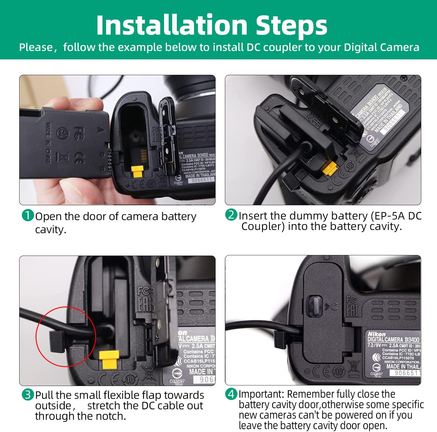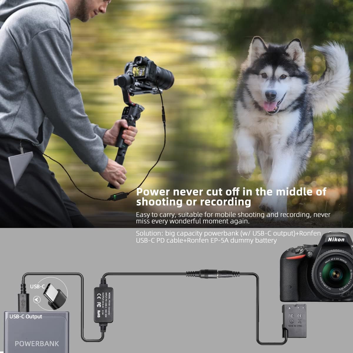RONFEN EP-5A USB Type-C PD Adapter Kit EP-5A + EH-5 AC Power Adapter Kit ReplacementThis kit can continuously power the camera, whether it is being used for a long time to shoot video, or live webcast, or record the growth of plants etc. You no longer need to worry about running out of the camera battery. It can help you record every wonderful moment continuously. Some use cases: indoor and outdoor shooting, such as: studio, home, mountaineering, camping, etc. With camera as webcam for video conferences, continuous long-term recording of Youtube, Tiktok, Vlog, Ins, Facebook videos, added time-lapse feature to your life!Compatible with Models: Digital cameras Nikon D3100, D3200, D3300, D3400, D3500, D5100, D5200, D5300, D5500, D5600, Df, Coolpix P7000, P7100, P7700, P7800.Package Include:1 x USB Type-C cable with PD-BX convertor (Length: 1.2M)1 x EP-5A DC Coupler (EN-EL14 ENEL14 EN-EL14a ENEL14a dummy battery)1 x PD 30W adapter / quick chargerInstructions for use (IMPORTANT):★ Installing the DC coupler into the battery cavity, routing the cable through the side/the slot in the camera and fully closing the battery cavity door;(key step if you leave the battery cavity lid open the camera won't be able to be powered on.)★ When the camera cannot start or take pictures normally, please choose a mobile power or power adapter with at least 3A high current.★ Some chargers are equipped with identification components, which can’t identify the camera, so it is not recommended. RONFEN is a manufacturer of camera power adapter accessories. If you have any suggestions or questions, contact us timely to satisfy camera enthusiasts.Warranty & Support: 1. 12-months warranty since the purchase date.2. Friendly, Easy-to-Reach Support: online customer service is provided if any query. Do not hesitate to contact us if need.