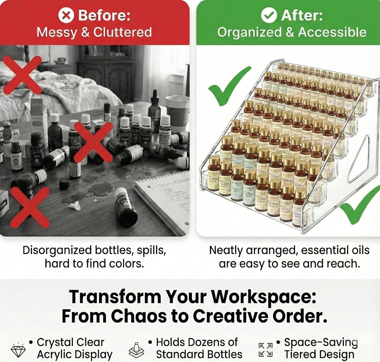 Discover the Ultimate Solution for Your Aromatherapy Space! Our essential oil organizer is a must-have for any enthusiast. This 7-tier acrylic essential oil holder organizer provides a clear, elegant display for 5ml, 10ml, 15ml, and 30ml bottles,holds 56-100+ bottles.Sold as a convenient 2-pack, it instantly doubles your storage capacity. Key Features: High-Capacity 2-Pack: Organize a large collection with two premium 7-tier essential oil shelves, perfect for multiple locations. Universal Fit for All Bottles: Effortlessly store standard-sized essential oil bottles from 5ml to 30ml with secure, angled slots.Sleek & Space-Saving Design: Made of clear, durable acrylic, this compact stand saves space while beautifully showcasing your oils.Specifications: Color: ClearSize: 12.3x11.7x7.2 inches Package includes: 2 × Essential Oil OrganizerAchieve a clutter-free, professional look. Order your Essential Oil Display Stand now and transform your collection!