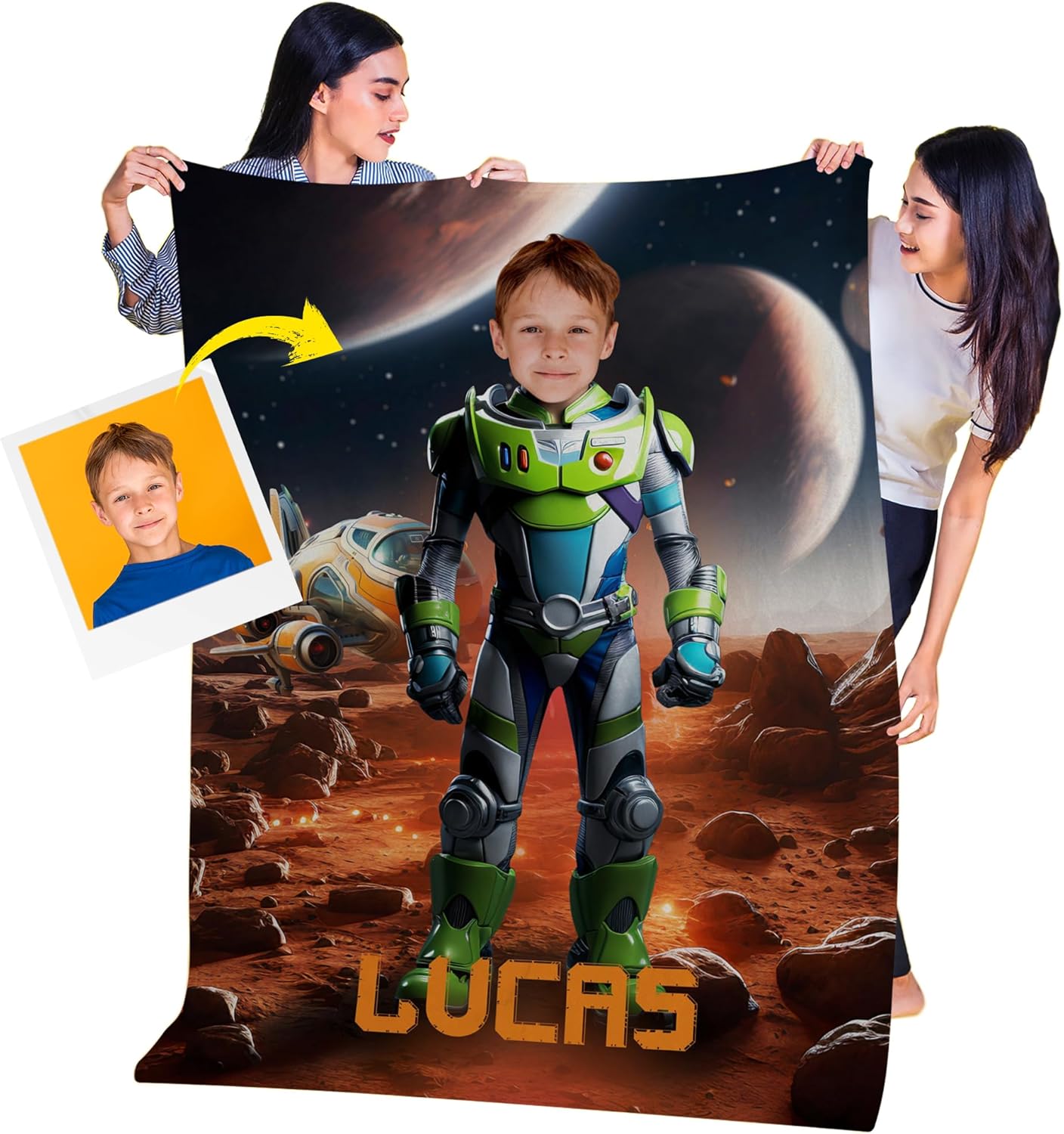 Custom blankets with the face of your child are a fun and playful way to keep your kids warm and cozy. These blankets feature a custom design with different characters such as dinosaur riders, princesses, and characters from your favorite movies and cartoons, adding a unique and personalized touch to your bedding collection. The design is printed on a soft and plush fabric, which is perfect for snuggling up on the couch or in bed. Two options for you to choose from: Minky SherpaIn addition to the Minky fabric, these custom blankets also feature a cozy Sherpa backing, which adds extra warmth and comfort. The Sherpa fabric is thick and fluffy, making it perfect for cold winter nights or chilly mornings.The blankets come in three different sizes: 30”x40” 50”x60” 60”x80”You can choose the one that best suits your needs. Whether you need a small throw blanket to drape over your shoulders while reading a book, a medium-sized blanket for curling up with on the couch, or a large blanket for snuggling up in bed, there is a size available for you.Overall, these personalized photo blankets are a fun and cozy addition to any home. They are made from high-quality materials and feature a unique design that is sure to make you smile every time you use them.Join our large family of Factory4me customers! We place emphasis on the quality of our goods. Buying our products, be sure that they all are of high quality. We care about every client, our aim is to make you happier!
