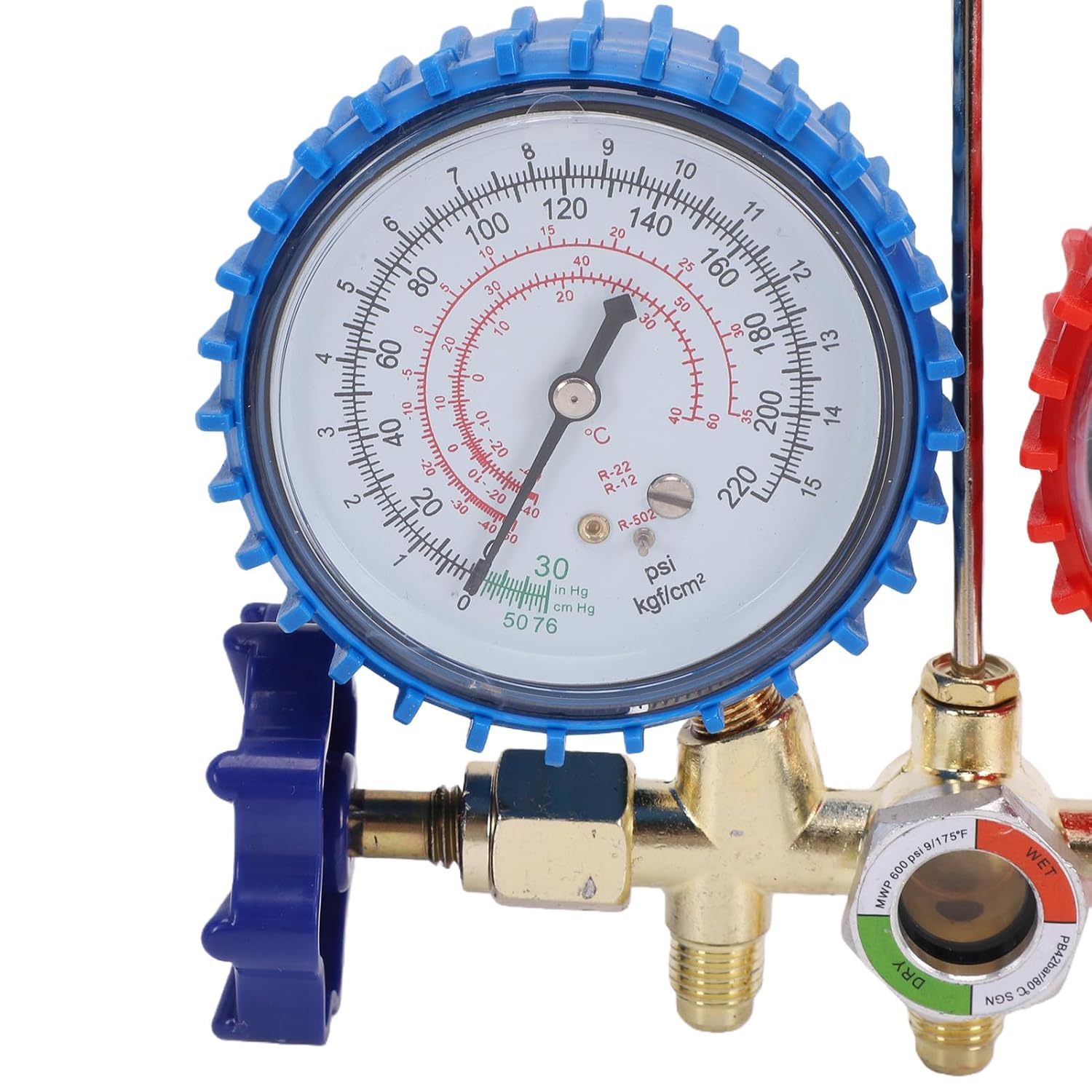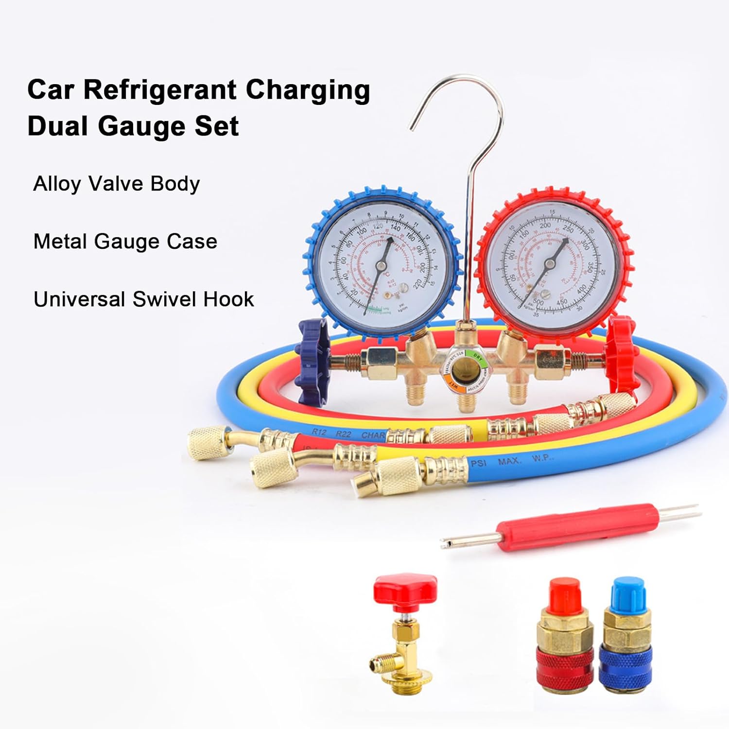 Specification: Item Type: AC Manifold Gauge Set Port Size: 1/4" SAE Connector Compatible Refrigerants: R134a, R22, R12, R502 Valve Body Material: Forged Alloy Hose Specifications: Maximum Working Pressure 500 PSI; Maximum Burst Pressure 2500 PSI Hose Description: Heavy-duty three-color charging hoses designed for pressure testing, vacuuming, and refrigerant charging Product Features: Stable valve core, impact protection How to Use: Connection: Connect the high‑pressure fitting of the manifold gauge set to the high‑pressure side of the air‑conditioning system, and the low‑pressure fitting to the low‑pressure side. Ensure all connections are tight and secure to prevent leaks. Air Purge: Open the manifold >gauge. When you hear the sound of refrigerant gas, gently loosen the screws to release gas for a few minutes, expelling air from the hoses to ensure accurate operation. packing list: 1 x Manifold Gauge 2 x Couplers 1 x Can Tap Valve 1 x Valve Core Wrench 1 x Hook 3 x Refrigerant Charging Hoses