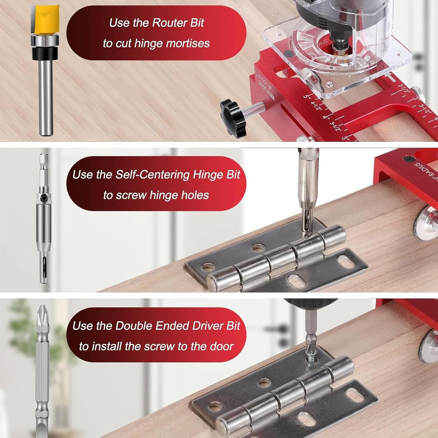 Spec: Item Type: Door Hinge Jig Kit Product Material: Aluminum Alloy Package List: 1 x Door Hinge Template 1 x Router Bit 1 x Self Centering Hinge Bit 1 x Double Ended Driver Bit How To Use: Take out the product, install and use. Note: It is only suitable for doors, not for door frames