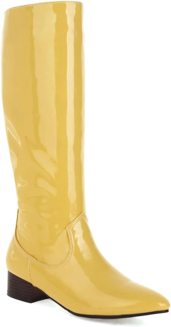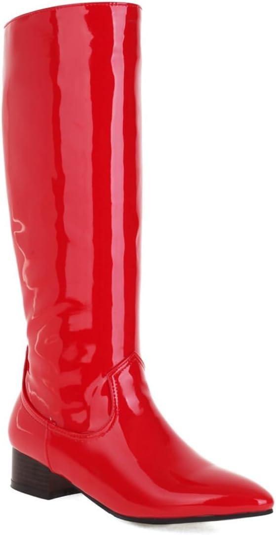 Fashion Knee High Dressy Boots For Womens Pointed Toe Pull On Low Heels Tall Wide Calf Rian Riding BootsSize Chart:Size 4 US = EU34 = Heel to Toe 22.0cm/8.66"Size 4.5 US = EU34 =Heel to Toe 22.0cm/8.86"Size 5 US = EU35 = Heel to Toe 22.5cm/9.06"Size 5.5 US = EU36 = Heel to Toe 23cm/9.06"Size 6 US = EU37 = Heel to Toe 23.5cm/9.25"Size 6.5 US = EU37 = Heel to Toe 23.5cm/9.25"Size 7 US = EU38 = Heel to Toe 24cm/9.45"Size 7.5 US = EU39 = Heel to Toe 24.5cm/9.65"Size 8 US = EU39 = Heel to Toe 24.5cm/9.65"Size 8.5 US = EU40 = Heel to Toe 25cm/9.84"Size 9 US = EU41 = Heel to Toe 25.5cm/10.04"Size 9.5 US = EU42 = Heel to Toe 26cm/10.24"Size 10 US = EU42 = Heel to Toe 26cm/10.24"Size 10.5 US = EU43 = Heel to Toe 26.5cm/10.43"Size 11 US = EU44 = Heel to Toe 27.0cm/10.63"Use your length and width measurements to find your shoe size on the above size chart. If your foot is fat or wide, please select a bigger size up.PERFECT ITEM FEATURES:☛Item Type: Knee High-boots☛Main Material: High Quality Patent Leather upper; Comfort Velvet Lining; Non-skid Rubber sole.☛Closure_type: Pull On☛toe_style: Pointed-toe☛Heel Height: Heel Height 1.37 inch☛Width: Medium (BM)☛Season: Spring/Autumn/Winter☛Color: Multiple colors optional☛Occasion Lifestyle: Fashion,Classic,Casual.