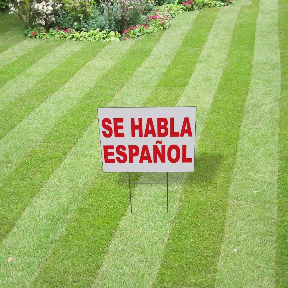 Weatherproof Outdoor for Sale Yard Sign Share your ideas, opinion, beliefs & advertisement in your neighborhood with our yard garage sale sign. Our street sign provides the most economical form of advertising and can be displayed along roadsides, in front of stores or in gardens. The text reads se habla espanol . Perfect as: se habla espanol yard sign, spanish sign for yard, foreign signs spring, spanish spoken signs with stake, or foreign language espanol corrugated plactic sign. This hablamos , spanish words , to talk in spanish and se habla yard sign can also be easily mounted anywhere without the stand with zip ties, screws or nails (not included). We print with high quality inks with vivid colors making sure your advertisement sign is being seen! Our designs are professionally printed with state-of-the-art equipment guaranteed to last for years. Our prints on for sale by owner yard sign will continue to look great after many years. We have more than 12 years of experience in the printing industry to offer you stunning detail and rich lifelike colors. BEST YARD SIGN ON THE MARKET! ** Made from high quality corrugated plastic sheets ** Perfect for outdoor ** Treated against UV & water to last for years ** Stand included for an easy ground installation ** Design professionally printed with bright colors Whether you are a business owner or a homeowner, you will be 100% satisfied with our yard signs.