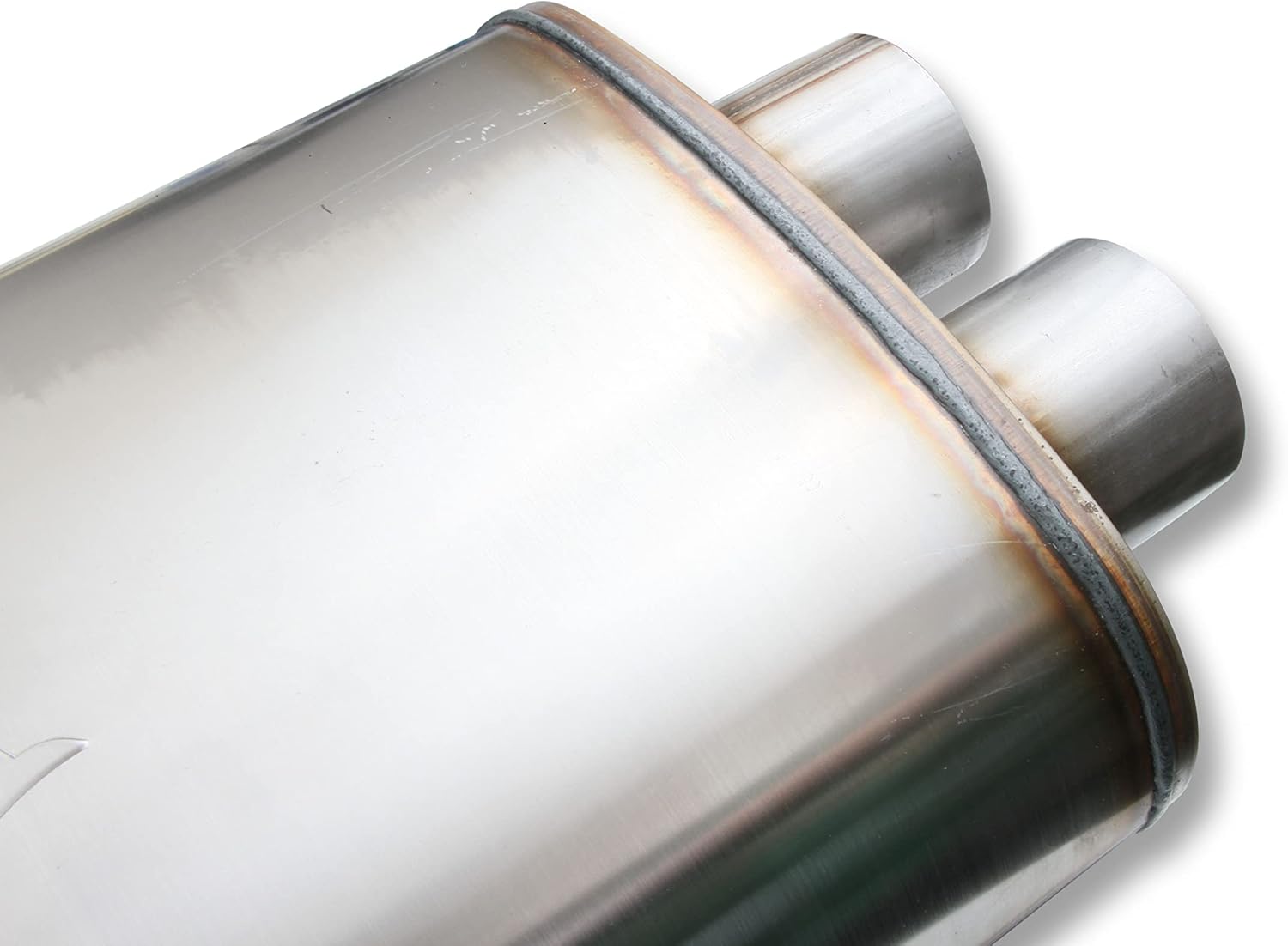 Unleash your Monster with Flowmonster 409 Stainless Steel performance mufflers! The Flowmonster series of absorption style mufflers deliver a moderate tone for the enthusiast looking for a deeper, more aggressive exhaust note than most OE (Original Equipment) mufflers, unlike the racey exhaust note associated with "chambered" style mufflers. Interior construction features 3.50 inch "straight-through" perforated 409 stainless steel tube surrounded by high-temperature sound absorption packing material which helps to deliver a deeper, mellower exhaust note. The internal design is reversible allowing the flexability to be installed in either direction to best accommodate fitment with the intended vehicle. The fully MIG-welded 409 Stainless Steel material is embossed with the "FlowMonster" logo on the case.