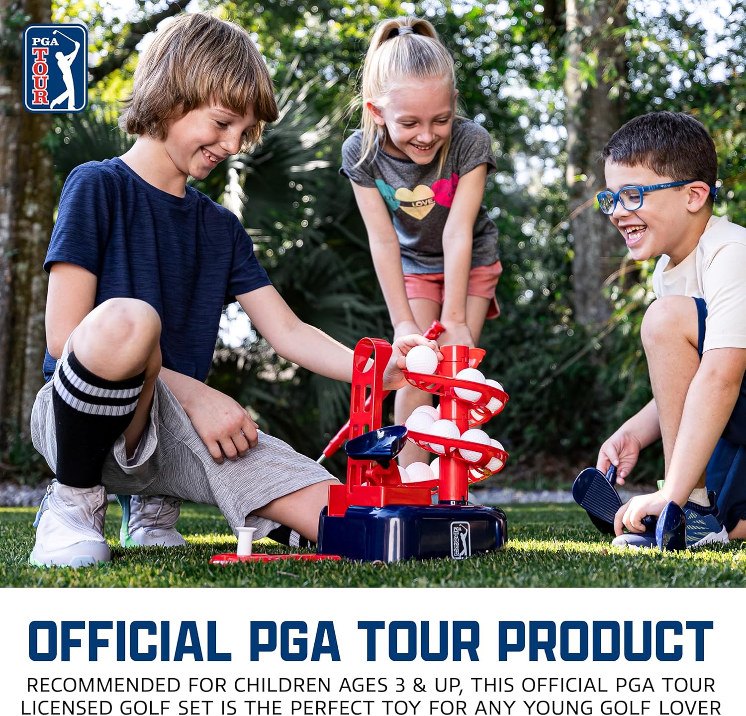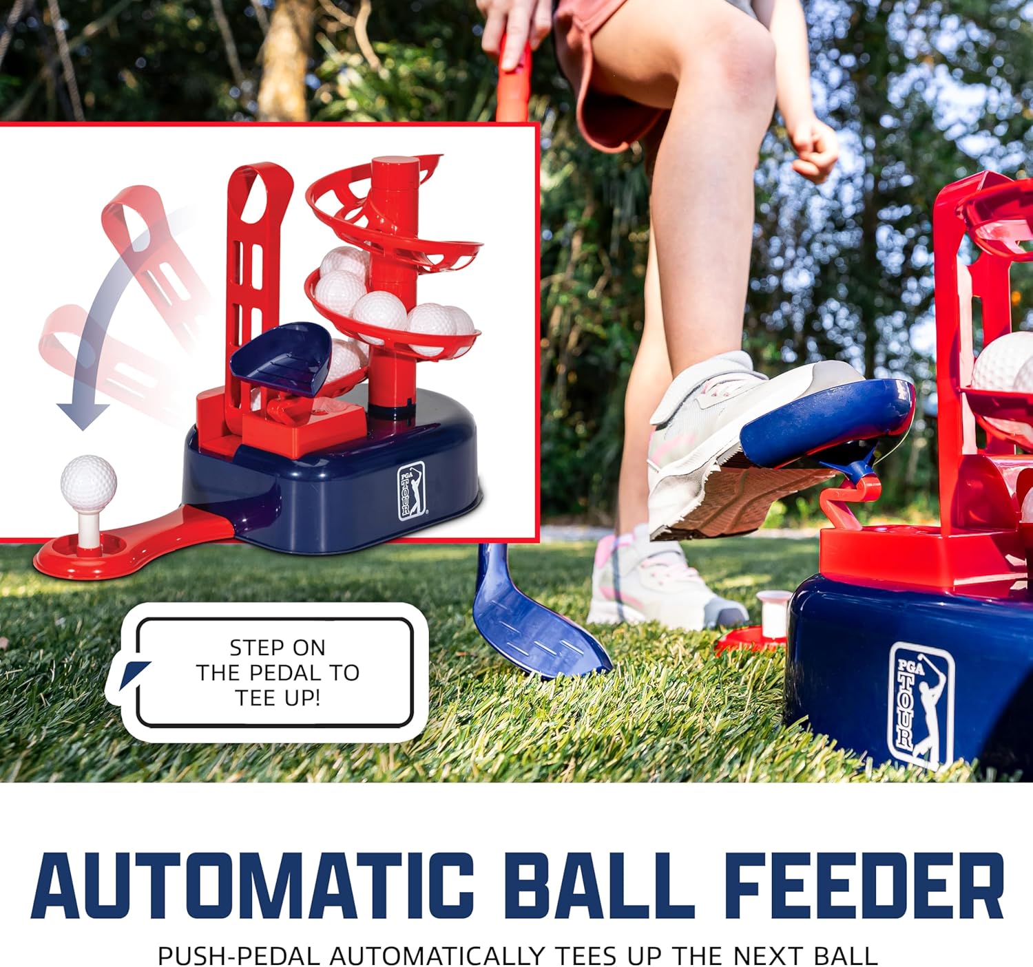 Get your little one into the swing of things with the Franklin Sports PGA Tour Kids Golf Tee Trainer — a fun, easy way for kids to learn golf like a pro! This all-in-one golf toy set has everything kids need to practice their skills and have a ton of fun. Designed with a push-pedal automatic ball feeder that automatically tees a new ball up after each shot, the PGA Tour tee trainer allows kids to practice their swing without the hassle of resetting after each shot. Each golf set comes with an adjustable golf club with multiple club heads included for both left and right-handed players. The club is also adjustable in length so kids of all ages and skill levels can develop confidence in their swing and keep playing as they grow. The set also comes with (15) plastic golf balls and features convenient built-in ball storage, keeping everything organized and ready for continuous play. Ideal for indoor or outdoor use, this trainer is a great tool for teaching young golfers proper form, and introducing them to the fundamentals of golf in a fun, hands-on way. This youth plastic golf toy set is the perfect way to introduce your kids to the game of golf, so grab your Franklin Sports PGA Tour Kids Golf Tee Trainer and swing away!