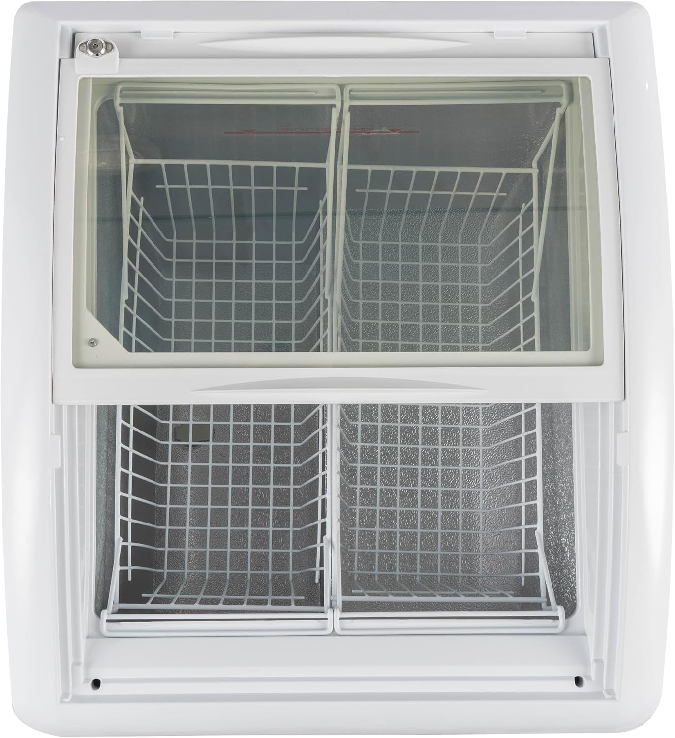 Be it running a small gas station, expanding your cafe offerings, or even keeping extra frozen foods handy in your garage this multipurpose glass top freezer makes it simple to store all kinds of delicious options. A vertical design that’s easy to use almost anywhere this 4 cu. ft. freezer offers a sleek, eye-catching style perfect for making food accessible. Great for commercial sales or everyday home use this chest freezer supports all your frozen food ideas. Product Details: • Chest Display Freezer (4 cu. ft.) • Glass Top Insulated Door • Pre-Painted Steel Interior • Energy Efficient Cooling • Wider Temperature Range • Unique Curved Top Styling • Color: White