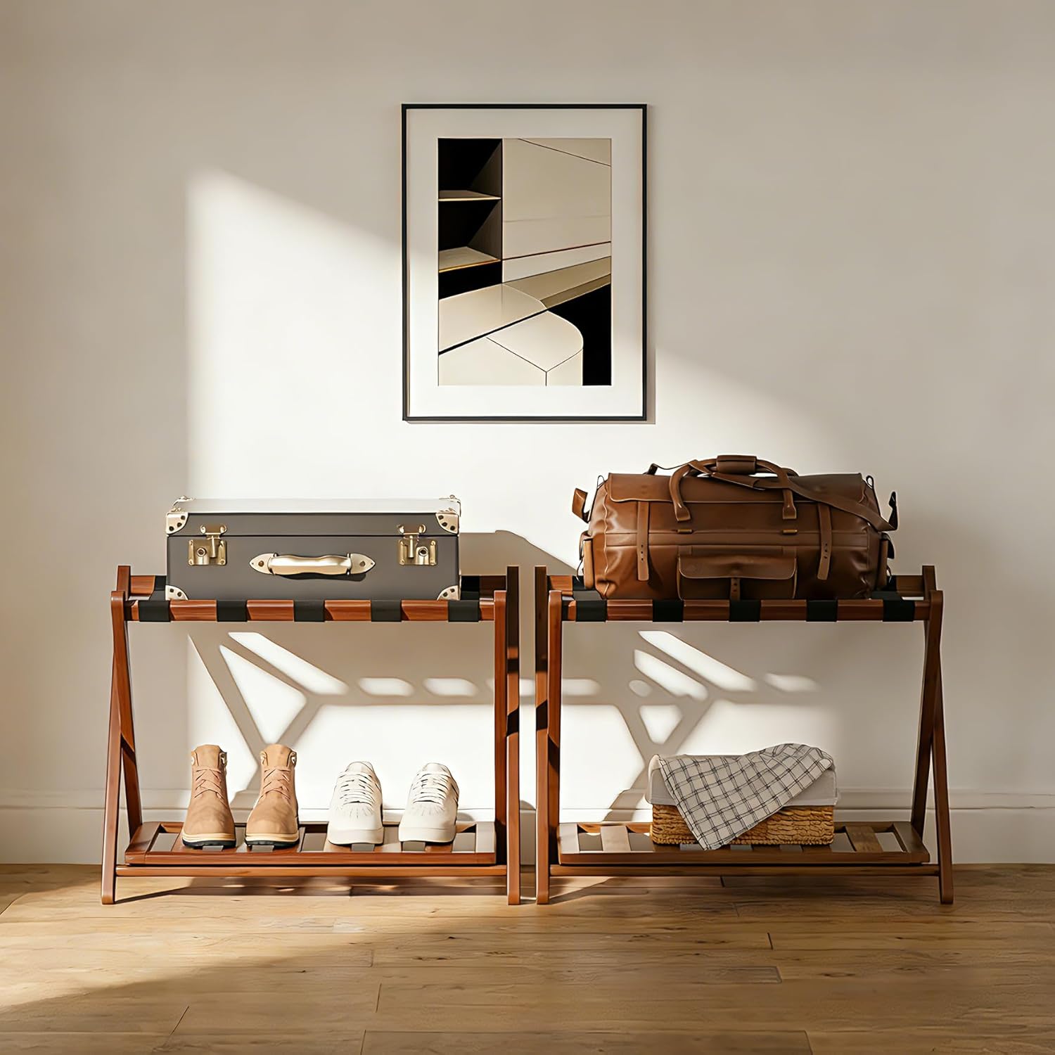 Features of this bamboo luggage rack: -Made of natural bamboo, the bamboo luggage rack features an upgraded and thickened frame, making it stronger and more load-bearing. -With Upgraded 5 heavy-duty sturdy nylon straps offers matchless durability that can withstand up to 200 LBS heavy luggage without waggling. -The guestroom luggage stand is wide enough to hold any size luggage and bags, Expand size is 26.77"W x 16.73"D x 20.47"H. -Folding design is easy to move and store. when not in use, you can fold the luggage rack flat to store under the bed, in the closet, behind the door or just in the narrow corner. 25.98” x 26.77” in folding status, -The bamboo suitcase holder has a 2-tier design. The upper shelf can withstand 150 pounds and the lower shelf can withstand 50 pounds, Perfect for shoes, slippers, hand luggage, bags or other items. -Perfect for guestrooms, bedrooms, living rooms, hotel rooms, vacation trips or short term rentals, etc Installation:Our luggage rack is fully assembled, no additional assembly is required, saving you time and effort. Simply open the packaging box and unfold the luggage rack. Specifications: ●Material: natural bamboo, nylon straps ●Size of suitcase stand: 26.77"W x 16.73"D x 20.47"H inches. ●Folded size: 25.98” x 26.77” inches. ●Product Weight: 8.8 bls (4kg)