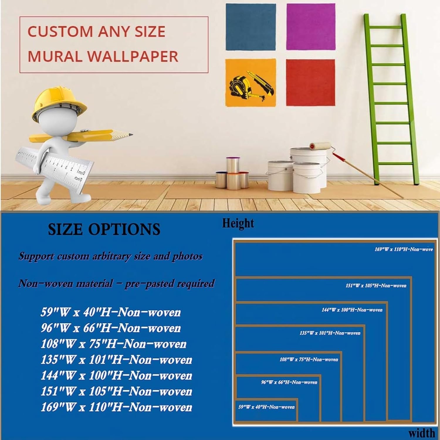 Wall mural inject fresh colors into your space, fill the gaps in the walls. Decorate your walls and make your walls full of artistic atmosphere.Why you choose us ?✔ Non-woven material is anti-deformation, and has good air permeability, thick and durable, no wrinkles,good ductility, waterproof, stain resistant, easy to take care of.✔ Infuse your space with fresh color, fill in wall gaps, 3D murals are immersive and imaginative, and the beautiful spaces, make the house more comfortable and Fill your home with color.✔ The living room is also a beautiful sight when a mural is applied to the sofa background of the living room. You will be surprised when the mural is installed. He turned out to be so beautiful.✔ Multiple uses bedroom, living room, nursery, dormitory, bathroom, sofa wall, background wall, kitchen, school, office, shop, bar, cafe, hotel, etc.✔ The murals on the wall are full of artistic atmosphere and inspiration. Choose your favorite mural style to bring you a wonderful new experience and help you enter a new world in a short time.Specification:59"W x 40"H/150 x 100cm/0.9Lb96"W x 66"H/245 x 168cm/2.6Lb108"W x 75"H/275 x 191cm/3.3Lb135"W x 101"H/343 x 256cm/5.5Lb144"W x 100"H/365 x 254cm/5.7Lb151"W x 105"H/385 x 268cm/6.3Lb169"W x 110"H/430 x 280cm/7.4LbMaterial: Non-wovenPackage includes:3D mural pack x1(Delivery in rolls)Carton package x1Notice: ✔ Wallpaper not pre-pasted, must use wallpaper glue or wallpaper powder(NOT INCLUDE).✔ Due to monitor display issues, actual colors may be different from online listing. ✔ Please remember to use wallpaper on smooth, clean, plain and grease-free surfaces.
