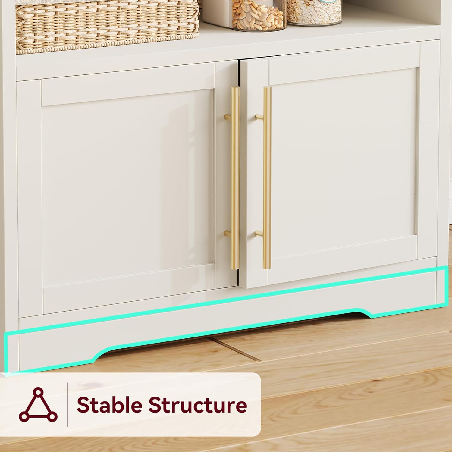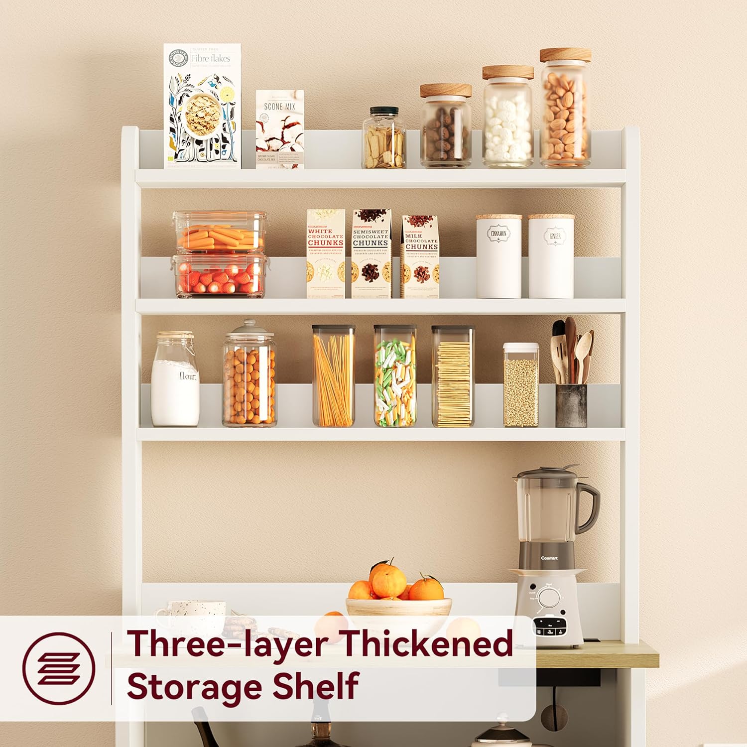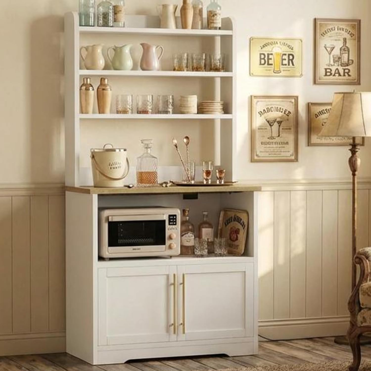 GarveeHome Bakers Rack with Power Outlet and 2 Doors, 63" Tall Farmhouse Wood Microwave Stand with Hutch & 3 Shelves, Coffee Bar Cabinet with Thick Counter, Sturdy Frame, for Kitchen, White Peer Wood