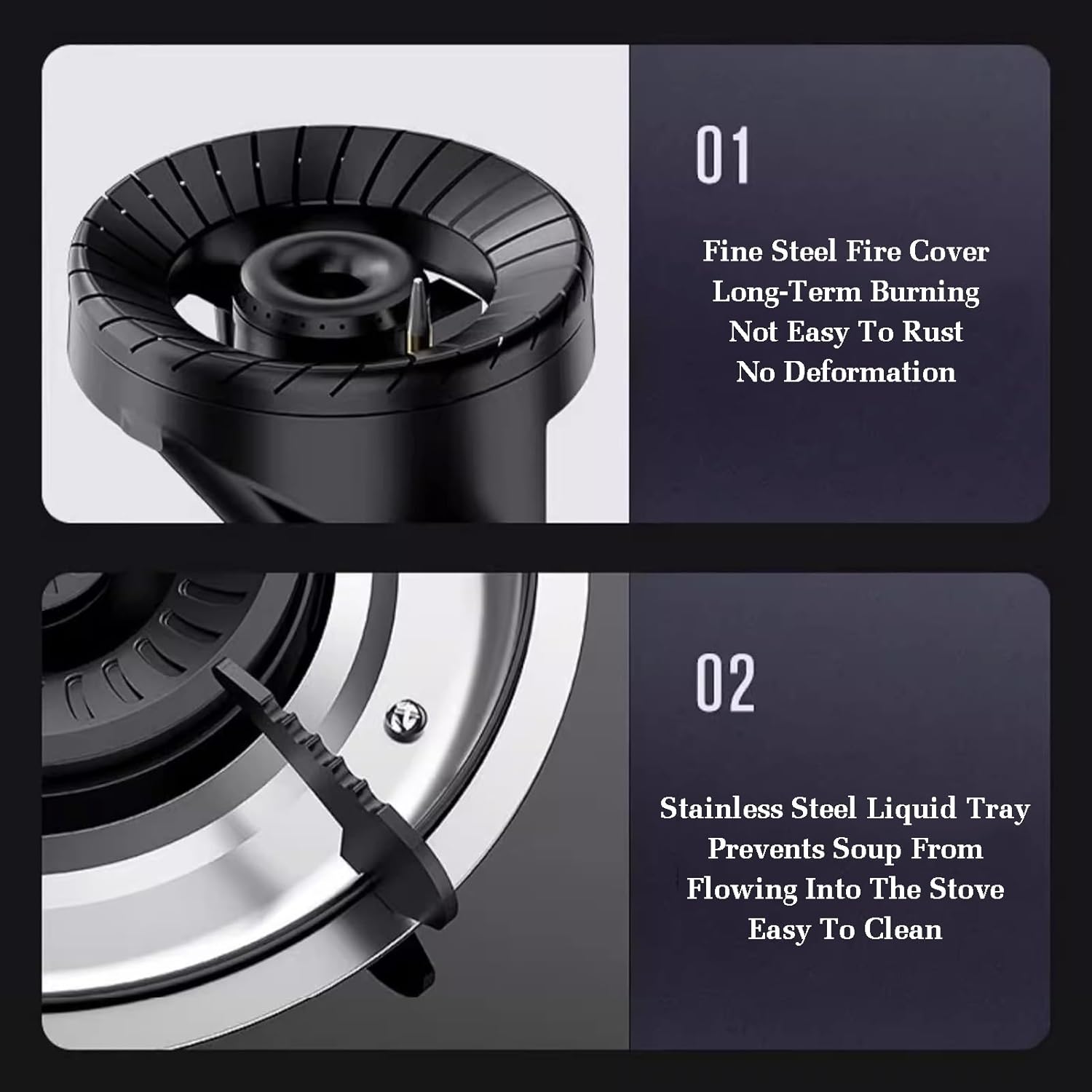 Multiple air nozzles for air premixing and reducing combustion exhaust gas, multi-directional air replenishment, so that the bottom of the pot is heated evenly, mixed air intake for direct injection and better replenishmentFeatures:1. Support all types of pots and pans2. Simple knob control3. Safe electric ignition4. With flameout protection function5. This model can be installed with natural gas and includes LPG conversion kitProduct name: Gas stovePanel Material: Stainless steelGas stove structure: tabletop/embeddedBurner material: cast ironApplicable: liquefied gas/natural gasFlame failure protection device: thermocouple flameout protectionIgnition method: electronic ignitionPacking list:1 x gas stove1 x connecting pipe1 x battery1 x bucklesReminder: Manual measurement may have an error of 1-2cm, please refer to the actual product2. There may be a slight color difference between the recording resolution and the screen, please refer to the actual color3. We only have gas stoves, other products are only used as scene props for reference