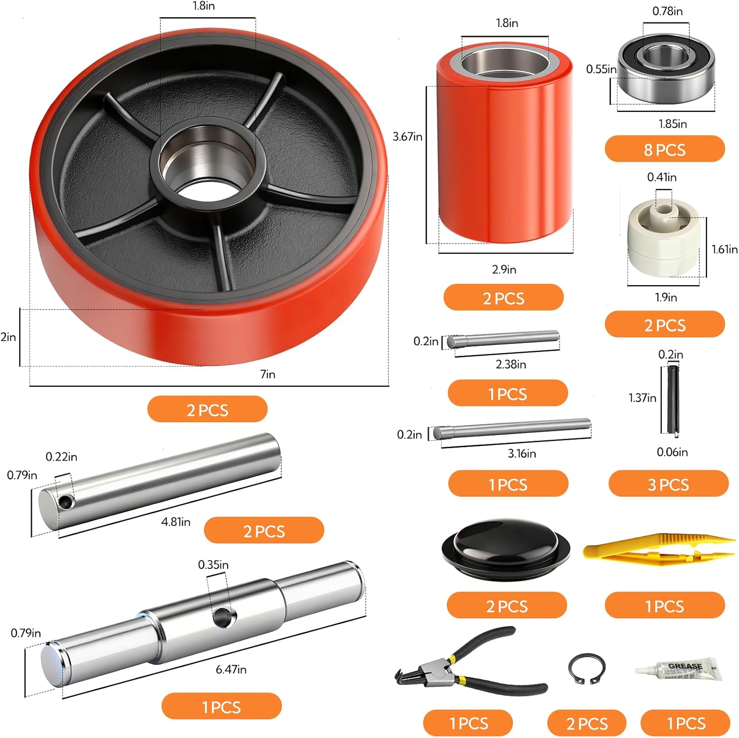 Product DescriptionUpgrade your pallet jack with our high-performance polyurethane wheels. Engineered for demanding environments like warehouses and docks, they deliver lasting durability and superior floor protection.Smooth & Effortless OperationThe high-density polyurethane ensures quiet, seamless movement across all surfaces. Reduces operator fatigue and enhances workflow efficiency.Heavy-Duty Load CapacitySupports up to 2300kg per wheel - built for heavy loads. Outstanding resistance to wear and deformation extends service life.Floor-Friendly & SafeSpecially formulated to minimize floor scarring and marks. Creates a stable base that prevents load shifts and accidents.Quick InstallationComplete with necessary tools for fast replacement. Anyone can install them quickly, minimizing equipment downtime.Universal CompatibilityDesigned to fit most standard pallet jack models. A reliable replacement choice for various applications.Key Features:High-density polyurethane construction2300kg load capacity per wheelFloor protection designEasy to installUniversal fit for standard pallet jacks