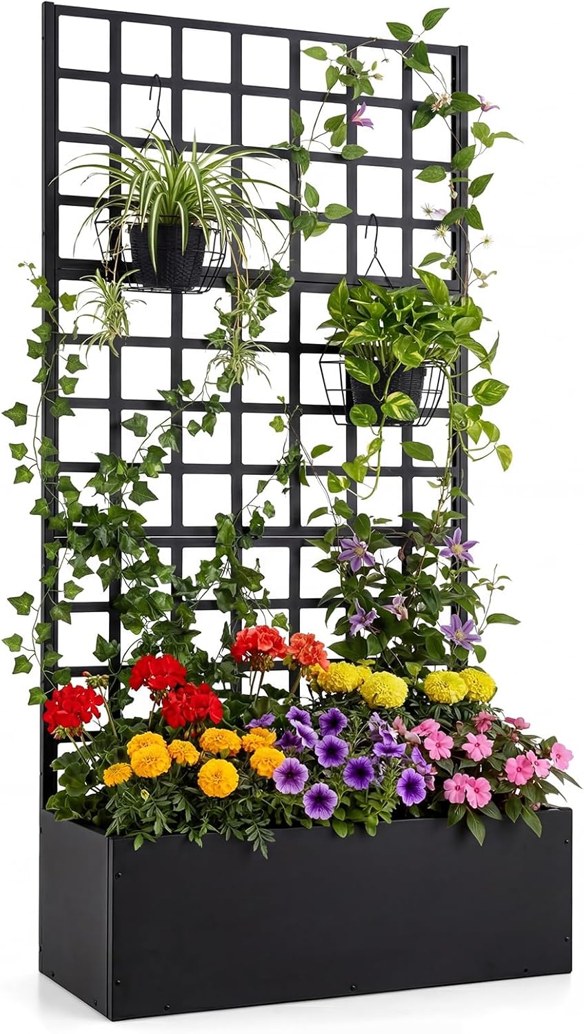 Description: Create a vibrant and tidy garden with our metal raised garden bed! Need a garden bed to keep your garden alive? Our freestanding raised garden bed adopts planter box and trellis combo design, enables you to customize your unique garden. The large raised garden bed is perfect to growing ivy, morning glories and hanging basket plants. Or you can hang small garden tools to create a tidy garden. Moreover, the deep planter box is designed to cultivate types of vegetables, flowers, herbs, etc. Made of powder-coated metal frame, the raised garden bed with trellis is robust, not easy to crack and durable for long lifespan. Additionally, its 2-in-1 design is space-saving design, making it a perfect choice to decor your garden, balcony, yard. And the assembly is not difficult with clear instruction! Features: Trellis ideal for hanging baskets, garden tools and growing climbing plants Large planter box is suitable for growing kinds of plants Metal frame is stable and not easy to deform Powder-coated surface is rust-proof and durable Firmly fixing screws and reinforced corners add stability Perfect addition to decor your garden, balcony or patio Easy to assemble with clear instruction Specifications: Color: Black Material: Metal Product Dimensions: 25” x 12.5” x 44” (L x W x H) Inner Size of Planter Bed: 24” x 11” x 12” (L x W x H) Load Capacity of Plant Bed: 110 lbs Load Capacity of Trellis: 22 lbs Net Weight: 19 lbs Package Includes: 2 x Metal Planter Box with Trellis 1 x User Guide