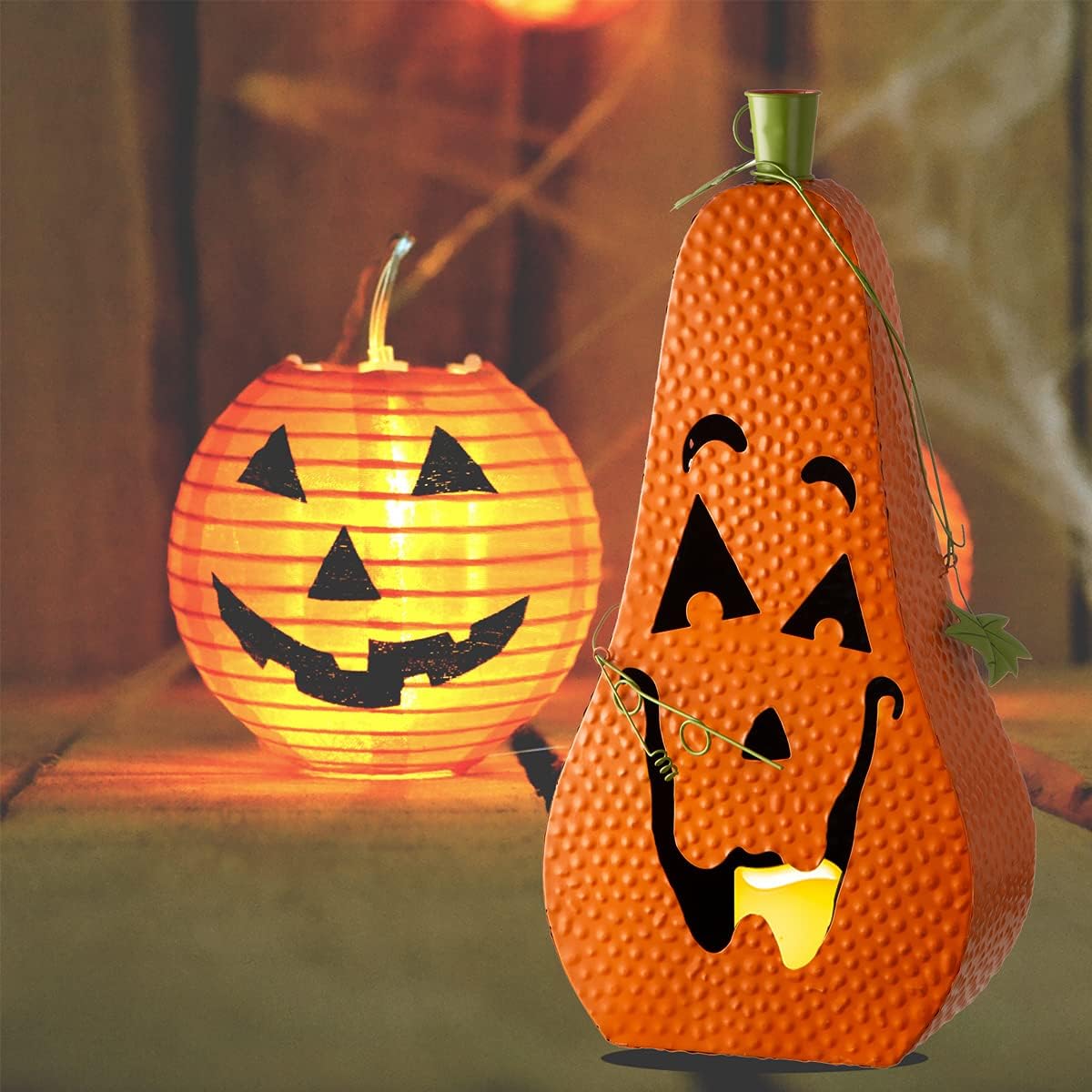 The large orange metal Jack O Lantern pumpkin decor, with shiny orange painting and green leaves, halloween out smile face, and a lighted LED Pillar inside. It will bring more brightless to your Halloween party.