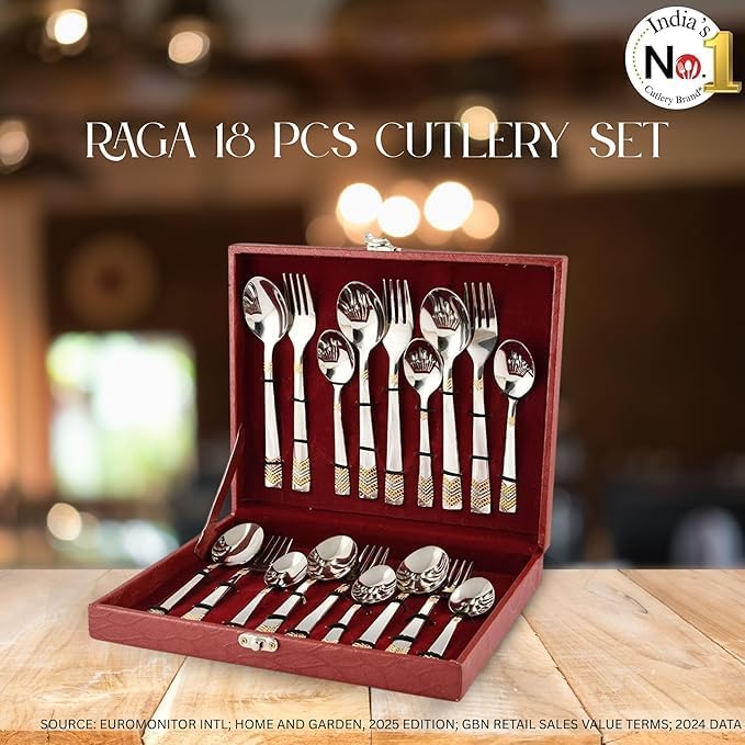 The FnS RAGA 24 karat gold plated cutlery set brings elegance and sophistication to your dining experience. This comprehensive 18-piece collection includes 6 dinner spoons, 6 dinner forks, and 6 tea spoons, providing everything you need for a complete table setting. Crafted from durable stainless steel with a luxurious gold plated finish, each piece combines functionality with refined aesthetics. The set arrives beautifully presented in a leatherette box, making it ideal for gifting on special occasions or adding a touch of opulence to your everyday dining. The gold finish creates a striking visual impact that elevates any table setting, whether for formal dinners or casual meals. The stainless steel construction ensures longevity and reliable performance, whilst the gold plating adds that extra layer of luxury. This versatile cutlery set suits both daily use and special celebrations, bringing a sense of occasion to every meal.