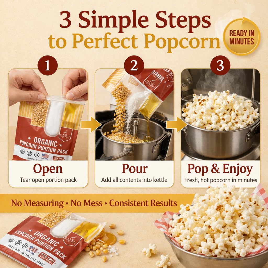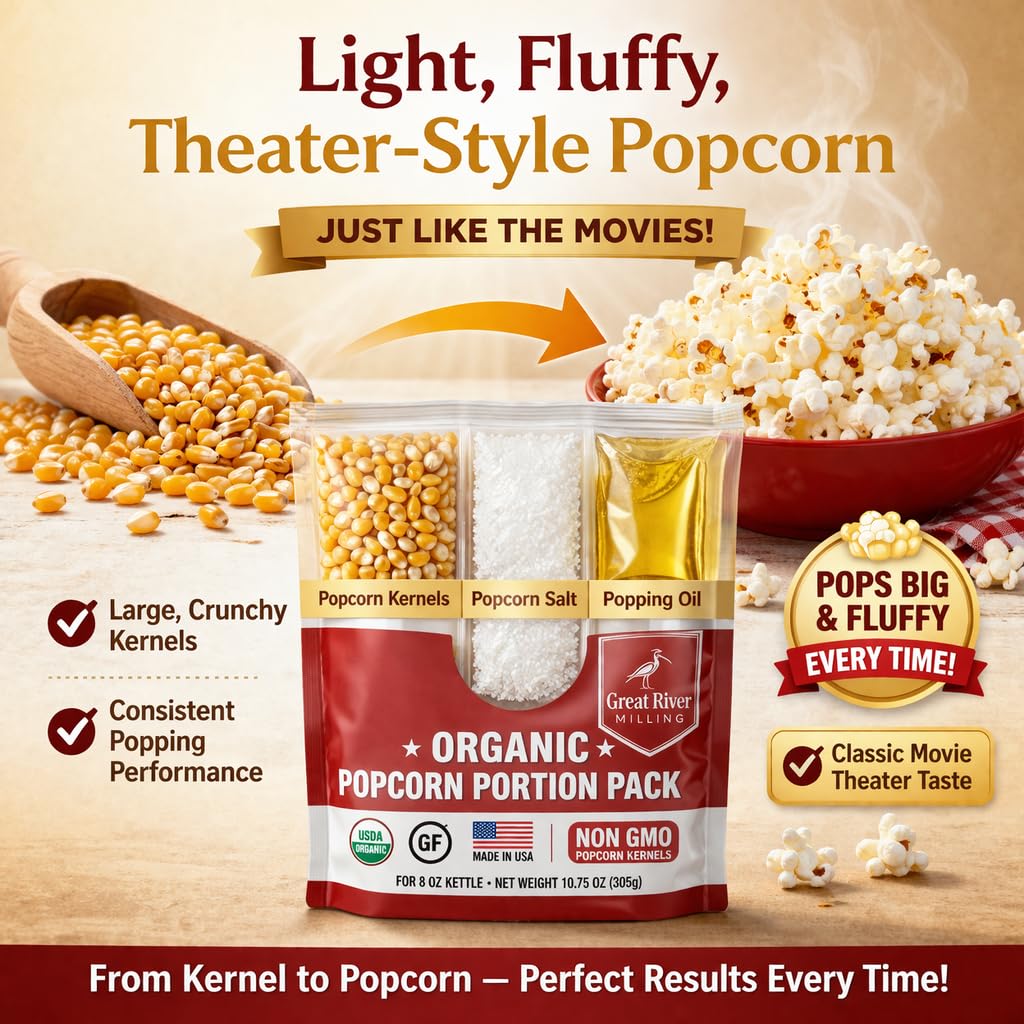 Bring authentic kettle popcorn flavor to every event with Great River Milling Organic Popcorn Portion Packs. Each convenient kit contains premium organic popcorn kernels, cooking oil, and seasoning — perfectly pre-measured for reliable popping and consistent taste. Designed for use in 8 oz kettle popcorn machines and more, these portion packs make it easy to create fresh, hot popcorn without measuring or guesswork. Simply pour the contents into your kettle and enjoy theater-quality popcorn in minutes. Whether you prefer a classic kettle machine, stovetop popping, an air popper, or a traditional Whirley-Pop, these portion packs are designed to deliver consistent results across multiple popping methods. Making them perfect for both home and commercial use. Made with clean, simple ingredients, our organic popcorn is Non-GMO, gluten free, and crafted for those who want a better snack without compromising on flavor. Whether you’re hosting a movie night, running a concession stand, organizing a fundraiser, or stocking up for events, these portion packs deliver convenience and performance every time. Rooted in sustainability and family values since 1975, Great River Milling is proud to provide products that bring people together through simple, wholesome food. Pop Great. Live Whole.