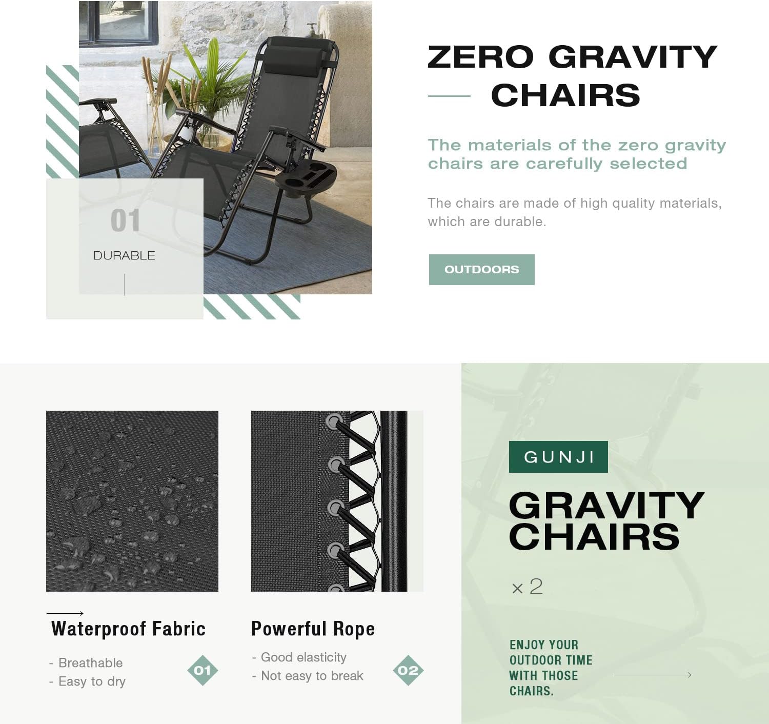 GUNJI is a professional furniture product company that focuses on providing customers with indoor and outdoor furniture, such as office chair, sofas, dining chairs, rattan sofa, patio lounge chair, etc. Our company’s products pursue high-standard designs in terms of materials and processes. Excellent quality, and excellent service are all our company's guidelines. The design concept of the patio reclining chair is "Portable & Comfort", if you want to enjoy a pleasant camping or trip with your family or friends, GUNJI patio chairs are a great choice for you.Specification:Material: Steel, TextileColor: Blue, BrownInstallation Required: NoDimensions of the normal state: 36.50 x 25.40 x 43.50 inchesWeight Capacity: 300 poundFeatures:The patio lounge chair is made of high quality mesh fabric, which is durable and waterproofThe thickened iron pipe frame provides a maximum load capacity of 300 pounds for the reclining chairThe removable headrest is soft and comfortable, which can help relieve pressure on your cervical spineThe patio chairs are equipped a large cup holder, convenient to place your cup, drinks, phone etc. The patio chaise lounge adopts foldable design, easy to carry and storage, perfect for camping and travel.Package Includes:Patio lounge chair x 2