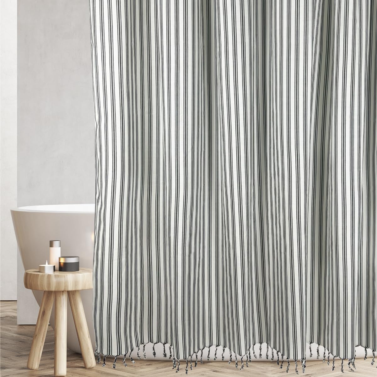 Instantly transform your bathroom from drab to bright, clean, modern and fresh with our Hall & Perry Vertical Stripe shower curtain. Made with polyester our high-quality curtain hangs seamlessly from top to bottom, while its modern pattern freshens any space and coordinates effortlessly with your surrounding decor. For more designer shower curtains, and to see the quality of curtain in our brand search for Hall & Perry Shower Curtains. Measures 72" x 72" including the hand-tied tassels on bottom.