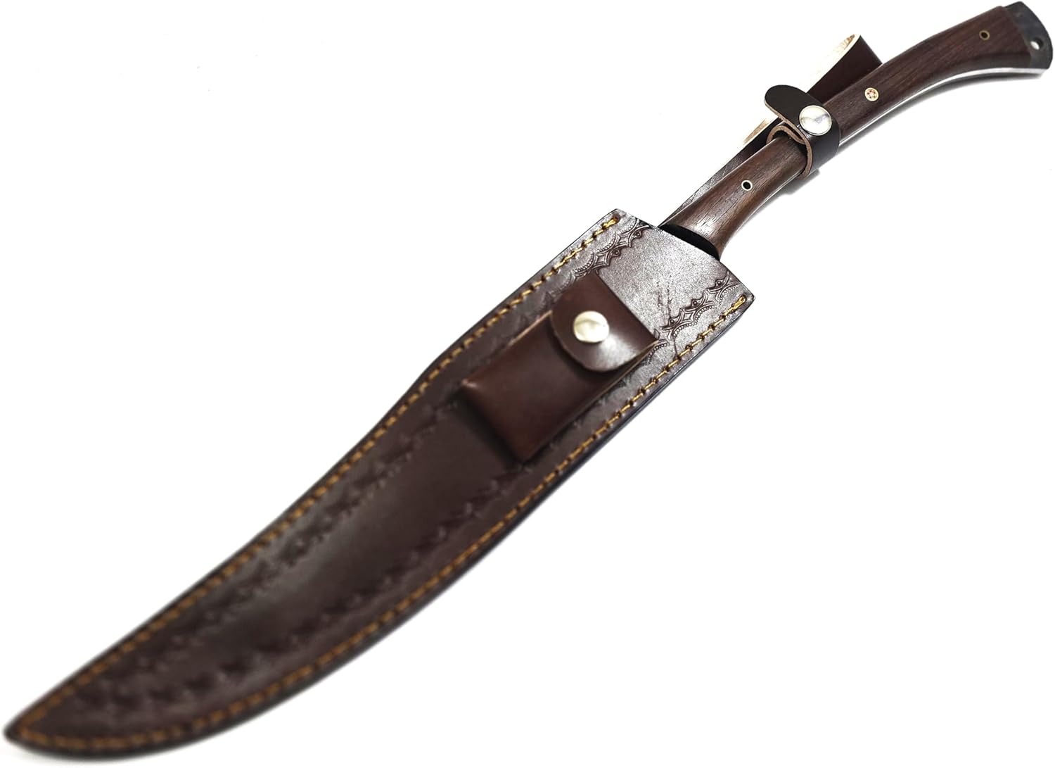 This impressive 21-inch machete knife combines functionality with classic design, featuring a robust blade perfect for heavy-duty cutting tasks. The full-tang construction ensures durability and reliable performance, while the elegant wooden handle provides a comfortable, secure grip during use. The blade's distinctive profile makes it effective for clearing brush, cutting small trees, and various outdoor tasks. Accompanied by a beautifully crafted leather sheath with decorative stitching and snap closure for safe storage and transport. The sheath's rich brown leather complements the wooden handle, making this tool as aesthetically pleasing as it is practical. The polished steel blade maintains a sharp edge and exhibits excellent cutting capabilities. Whether for agricultural work, camping, or general outdoor activities, this versatile machete delivers reliable performance while maintaining a classic appearance. Handle with appropriate care and caution.