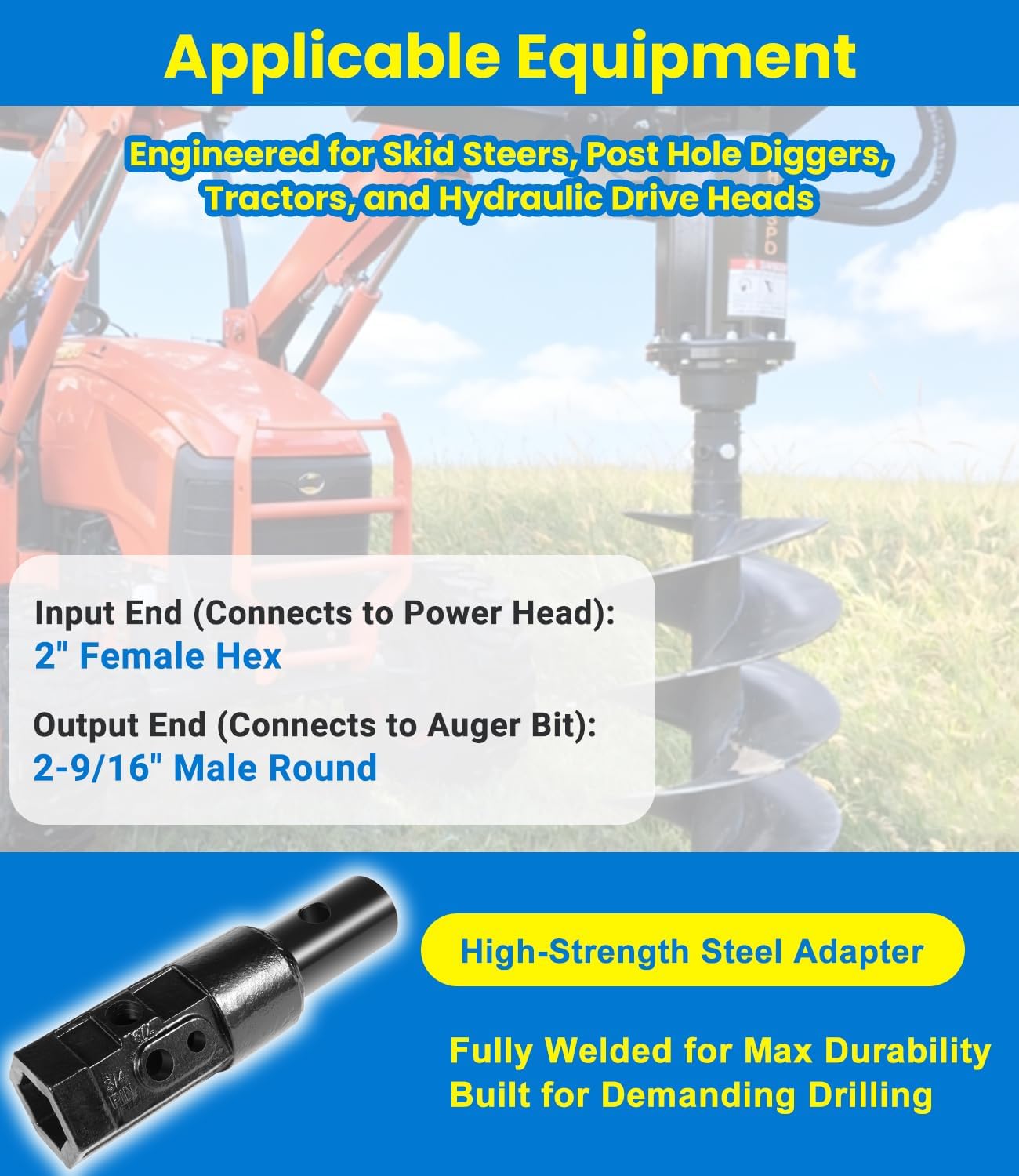 Professional-Grade Power Conversion for Your Toughest Jobs Upgrade your drilling efficiency with our Heavy Duty Auger Adapter. Designed specifically for professional operators, this adapter bridges the gap between different equipment standards, allowing you to use your high-performance 2-9/16" Round bits with a 2" Hex power head. No need to invest in a new drive unit—this is the ultimate cost-effective solution for your skid steer, tractor, or post hole digger. Engineered for Extreme Torque and Durability When you're boring through hard-packed clay, frozen ground, or rocky soil, you need a connection that won't fail. Our adapter is constructed from high-tensile, heavy-duty steel and features full-circumference welds at both connection points. This superior welding technique ensures maximum structural integrity, preventing the adapter from twisting or shearing under intense rotational pressure. Precision Fit for Maximum Safety Safety is paramount on the job site. The 2" Female Hex end is precision-machined to ensure a snug, wobble-free fit onto your power head, while the 2-9/16" Male Round end provides a standardized industrial connection. With pre-drilled holes for 3/4" and 7/8" pins/bolts, you can count on a secure attachment that won't slip or vibrate, reducing wear and tear on your expensive machinery. Versatile Applications Whether you are a professional contractor installing fence lines and foundation piers, or a farmer planting trees and setting poles, this adapter (Replaces Part #23-058) is built to handle the pressure. It’s a must-have attachment for anyone looking to maximize the versatility of their existing auger fleet. Product Specifications: Input: 2" Female Hex (Accepts 3/4" or 7/8" Pin) Output: 2-9/16" Male Round (Accepts 7/8" Pin) Compatibility: Fits Skid Steers, Tractors, Augers and Hydraulic Post Hole Diggers Material: High-Strength Fully Welded Steel Interchange Part Number: 23-058 NOTE: This listing is for the adapter only. Mounting hardware (pins and bolts) is not included. Please verify your equipment’s drive and auger sizes before purchasing to ensure a perfect fit.