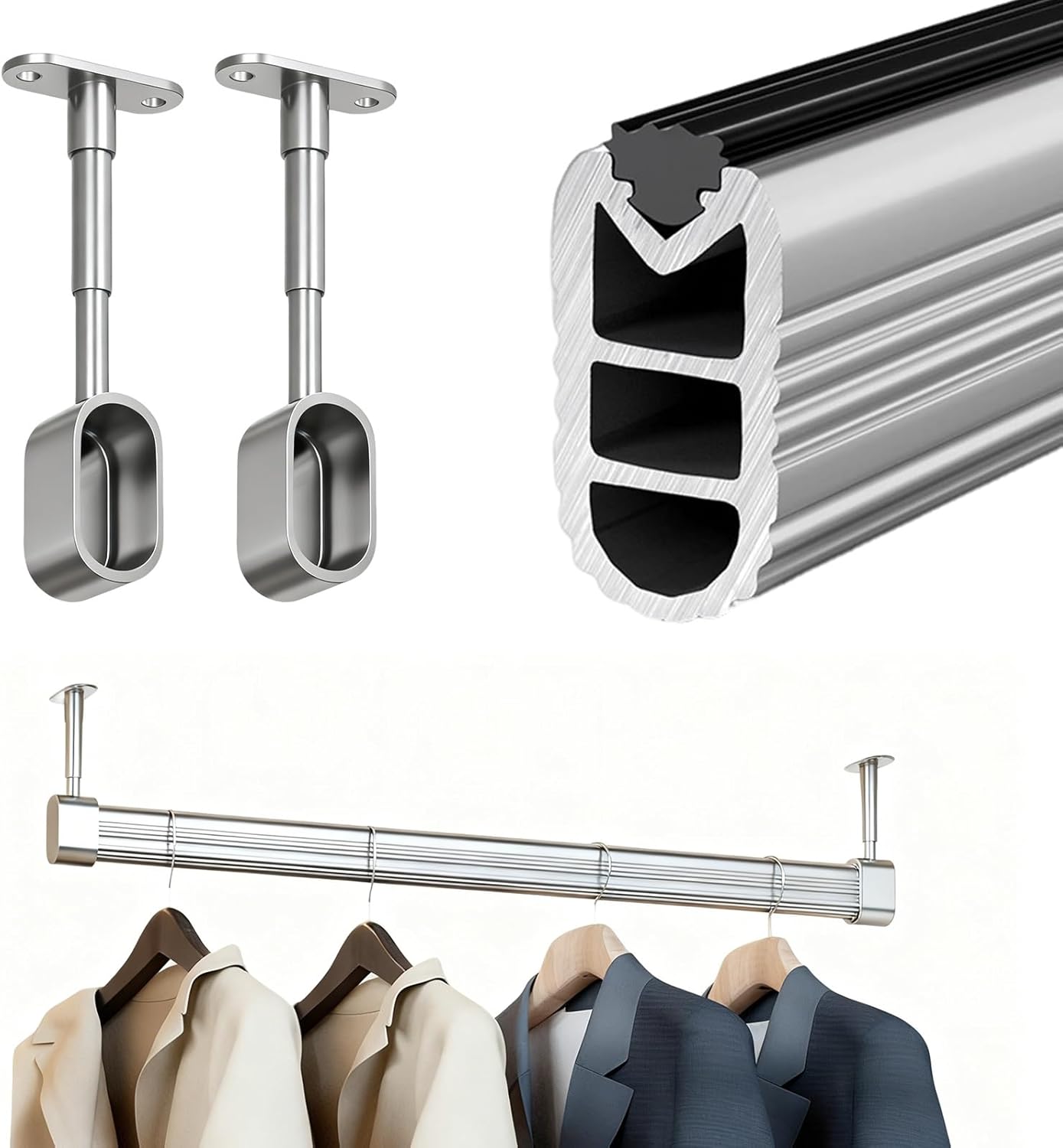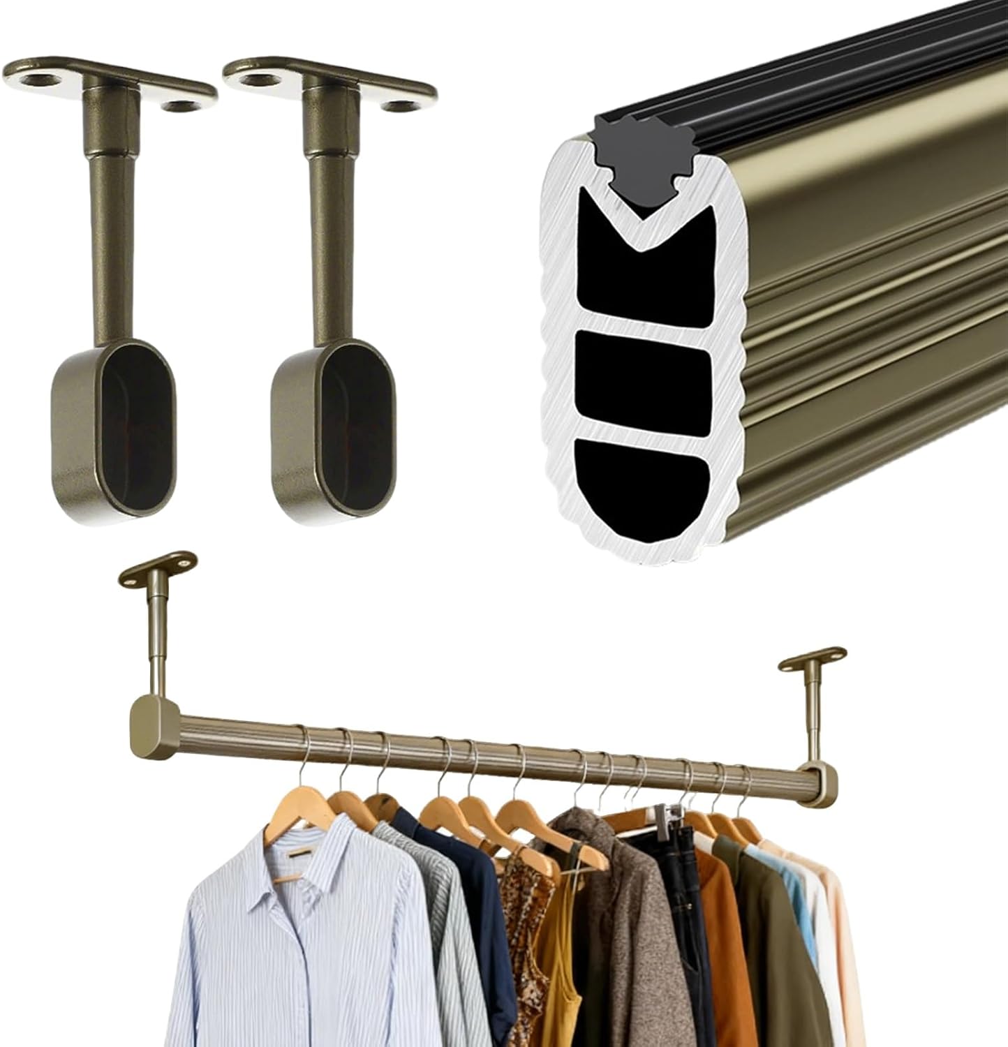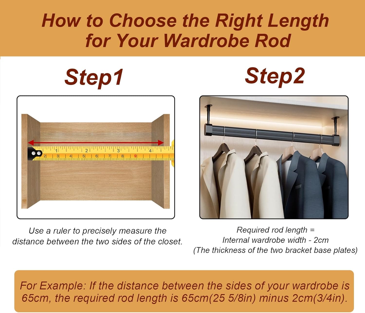 Closet Rod Top Mount Wardrobe Bars:Tired of a cluttered closet and unreliable hangers? Our sturdy clothes hanger rods offer a practical solution to keep your wardrobe organized. Designed to hold even the heaviest garments securely, these rods ensure that your clothes hang perfectly without sagging. Experience the joy of a tidy and accessible closet, transforming your space into a haven of order. **Package Includes:** - 1 x Closet Rod - 2 x Flanges - 4 x Screws **Specifications:** - Clothes Rail Length: 30-80cm (11 3/4-31 1/2in) - Clothes Rail Thickness: 2.4mm - Available Colors: Black, Silver, Champagne **Installation Made Easy:** With complete installation accessories included, even those without prior experience can set up their new closet rod effortlessly. **Key Features:** - **Stylish Metallic Finish:** The sleek design seamlessly blends with your home decor, enhancing the overall aesthetic. - **Robust Load Capacity:** Engineered to support heavy winter garments without bending, providing you with confidence in its durability. - **Smooth Anodized Surface:** Enjoy easy garment access with a refined surface that allows for effortless sliding. - **Versatile Use:** This dual-function rod can serve as both a clothes hanger and a curtain rod, catering to various home needs. **Important Notes:** - Please allow for slight variations in handmade measurements. - Color discrepancies may occur due to screen display differences. - Ensure to measure your wardrobe’s internal width accurately before purchasing to find the right rod length. Elevate your closet organization with our reliable hanger rods and enjoy a clutter-free space where everything is neatly in its place.