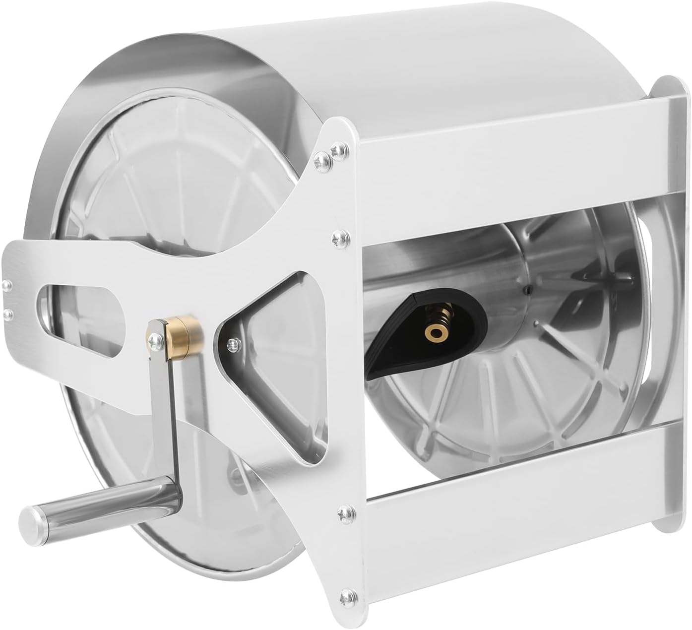 Details Ergonomic Handle: The ergonomically designed handle offers a comfortable grip, making it easy to roll up the hose.Practical Wall-Mount Bracket: This allows for quick and secure mounting of the product on the wall.Thoughtful Lid: When closed, it can provide a good shielding effect and prevent the water pipe from aging due to rain or sunlight. The handle on it also facilitates your access and cleaning of water pipes. ApplicationIt can hold up to a 164.04-ft long standard garden hose with 0.47-inch ID and 0.63-inch OD with a quick coupler for watering lawns and flowers, washing cars, bathing pets, watering crops, and more.SpecificationMount Type: Wall-mounted, Floor-mountedAssembly Required: YesNozzle Rotation Angle: 360°Handle Rotation Angle: 360°Material: Stainless Steel, BrassProcess: Nickel Plated Color: SilverStyle: ModernAvailable Hose Length: 50m/164.04ftApplicable Hose ID: 12mm/0.47inApplicable Hose OD: 16mm/0.63inProduct Size: 28*36*30cm/11.02*14.17*11.81inPackage Size: 38*33*33cm/14.96*12.99*12.99inGross Weight: 5kg/11.02lbsNet Weight: 4.75kg/10.47lbsPackage Included1* Hose Reel2* Wall Mount Brackets1* Quick Coupling ConnectorOther Accessories for Assembly