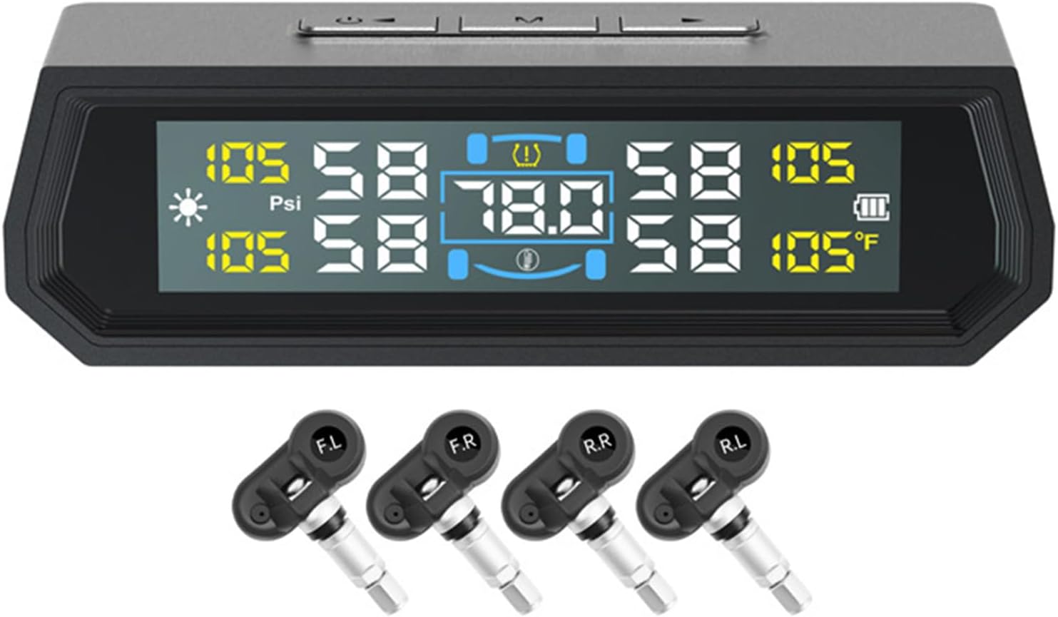 High Accuracy Internal Tire Pressure Systems With Sun Charging And 4 Internal Sensors For Accurate Readings Features : This tire pressure device utilizes advanced sunlight charging technology to absorb natural light , providing extended power duration with 50 % greater effectiveness than standard versions Perfect for vehicle owners and long distance travel Along with tire pressure tracking , this unit displays real time cabin temperature readings , allowing intelligent climate control adjustments for enhanced comfort during family trips or daily commutes Equipped with 4 integrated sensors , this monitor provides precise separate tire pressure measurements , enabling early detection of potential issues for road compared to basic tools Featuring a built in clock , this device shows time information alongside pressure data , offering added practicality for frequent travelers and vacationers needing better schedule coordination The included detachable bracket allows quick installation at any preferred dashboard location without occupying extra space , suitable for various vehicle models and user needs Specifications : Component : ABC+PC+copper Size : Approx.96x61x32.5mm / 3.77x2.4x1.27inch working voltages : 3.7V working temperature : 20°C-70°C levels : IPX7 Pressure ranging : 0 ~ 5BAR Transmission frequency : 433.92MHZ Transmission power : >10dBm Charging voltages : 5.1V Styles : A / B / C / D Package Includes : 1pcs Tire Pressure Systems Note : 1.Please allow 1-2cm errors due to manual measurement , make sure that you donot mind before you order 2.Due to the differences between different monitors , the picture may not reflect the actual color